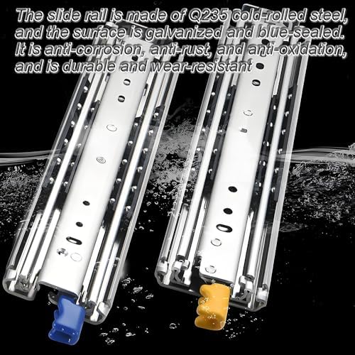 This heavy-duty drawer slide is suitable for retrofitting RV equipment, heavy-duty tool cabinets, shelves, cabinets, industrial drawers, trucks, vending machines, etc. Installation steps. 1. Find two horizontal lines at the installation position on both sides of the cabinet, and use screws to fix the outer fixed slide to the horizontal lines on both sides; (Note: the positioning on both sides must be parallel). 2. Pull the slide completely out and fix the drawer to the inner fixed rail with screws according to the horizontal line. 3. Installation is completed. Specifications Style: Simple, Modern Material: Cold-rolled steel Q235 Quantity: 2 Process: Galvanized finish Load capacity: 226.8 kg/500 lbs Slide width: 7.6 cm/3 inches Size: 10in-80in Package includes 1 pair of heavy-duty drawer slides (including 10 mounting screws)