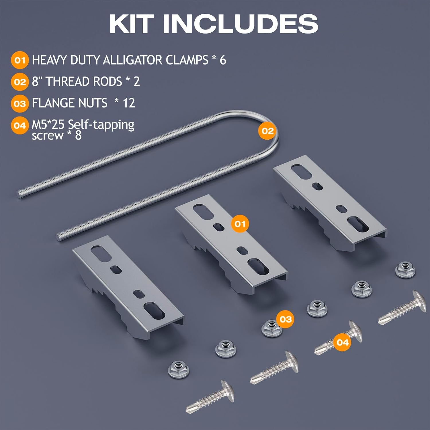 | Included Components | heavy duty alligator clamps, 8" thread rods, & flange nuts. |