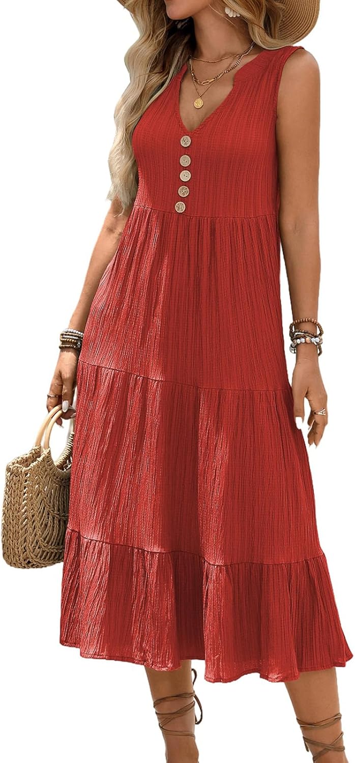 | character | Women's Casual Summer Dress 2025 Sleeveless V Neck Button Beach Sundress Tiered Ruffle Flows Skirt Midi Dresses |