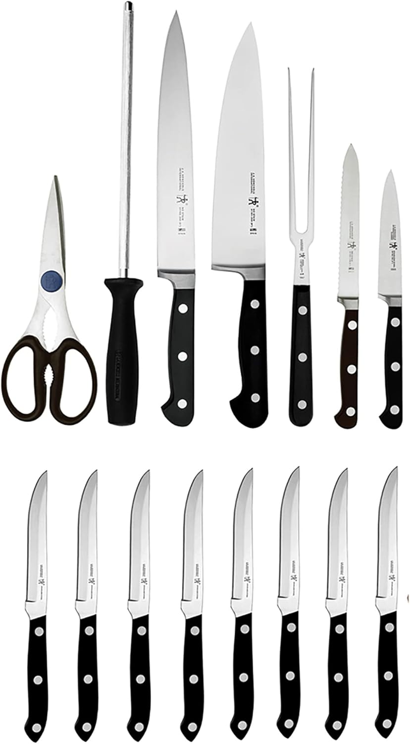 Prep work is easy with the Henckels International CLASSIC 16-pc Knife Block Set. Experience confidence with each cut thanks to the fine-edge precision blades that are honed for long-lasting sharpness. The 8" Chef's Knife, a kitchen workhorse, is ideal for chopping herbs and dicing onions while the 5" Serrated Utility Knife cleanly slices through tomatoes. Perfectly peel apples with the small 4" Paring Knife. With a seamless transition from blade to handle, the knives' fully forged construction provides balance as the traditional triple-rivet handles encourage tireless cutting. The handsome hardwood block handily keeps this useful knife collection within reach on your countertop. Henckels International makes essential kitchen tools every home chef needs. From steak knives to spatulas, every product boasts high quality at an exceptional value. Created in 1895 by Zwilling J.A. Henckels, this value-driven brand guarantees the same durability, design and ease of use for which the global company is known. Equip your kitchen with expertise with Henckels International.