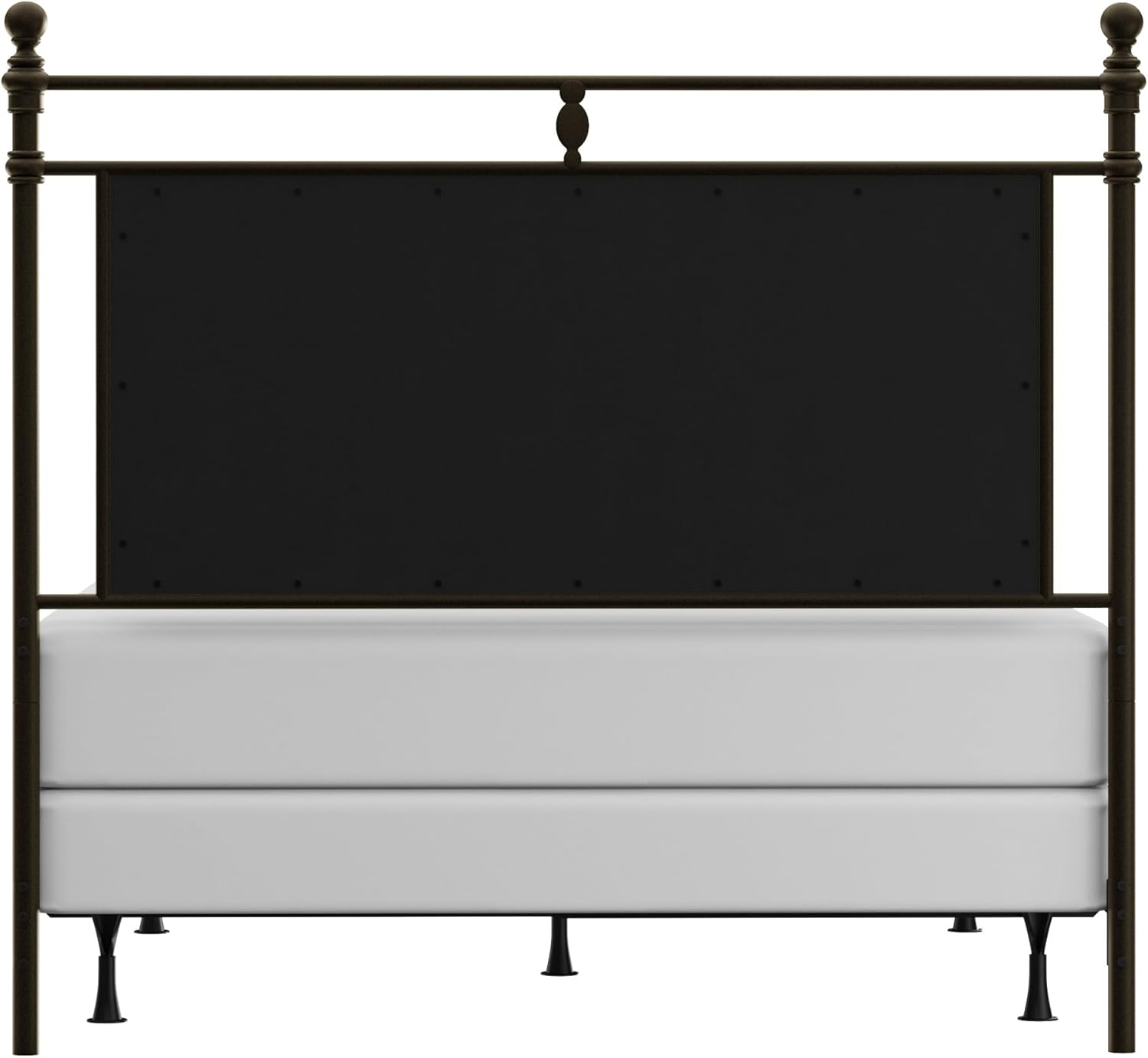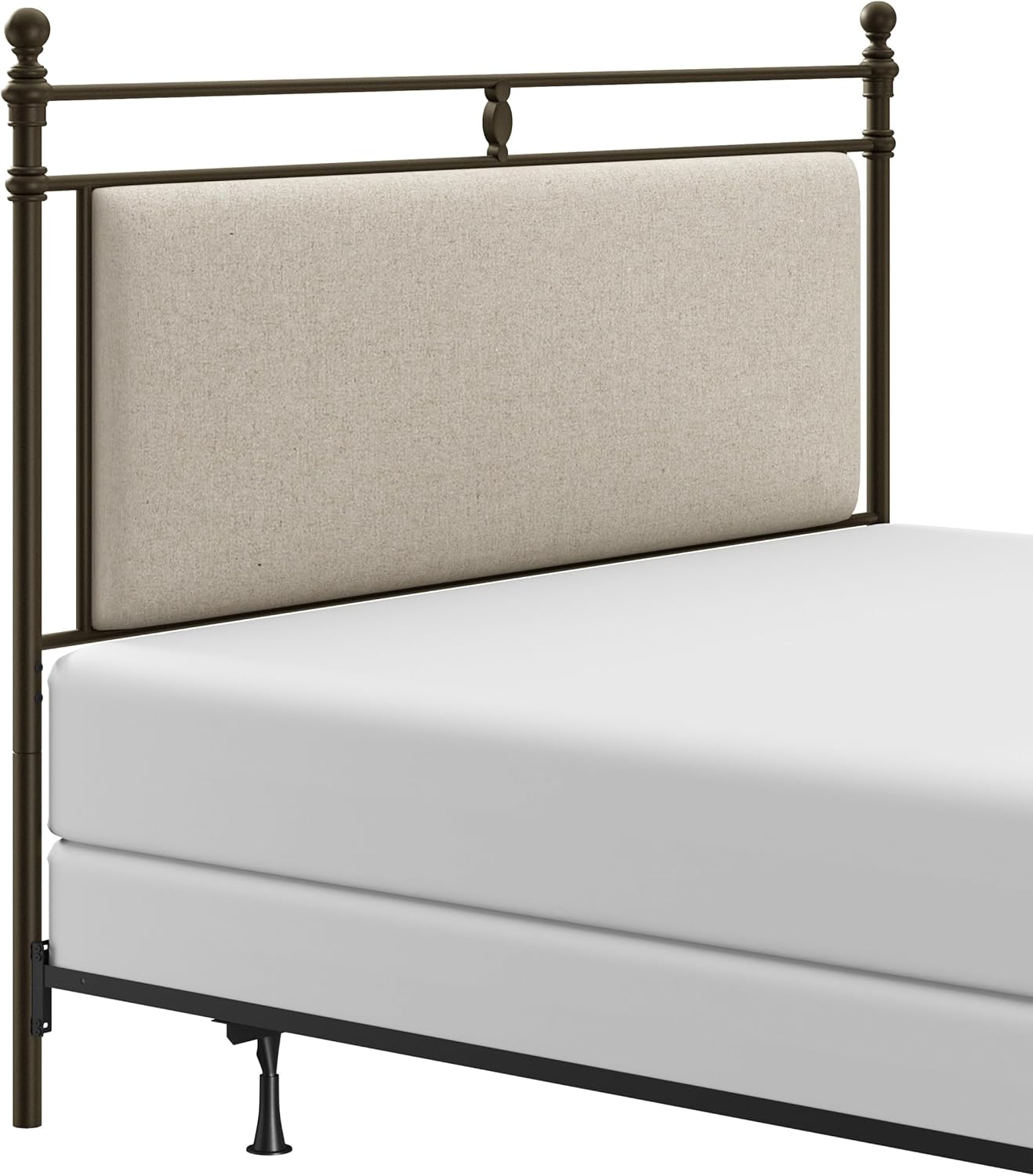 This bed combines the distinction of an embellished metal frame with the luxury of upholstery. The adornments featured prominently on the center top rails strike the perfect balance amidst the turned posts with round finials and bun feet. This traditional queen-size bed features a rustic brown finish on the metal frame and stone-colored upholstery to achieve a sophisticated look. Headboard, footboard and bed frame included. Assembly required.