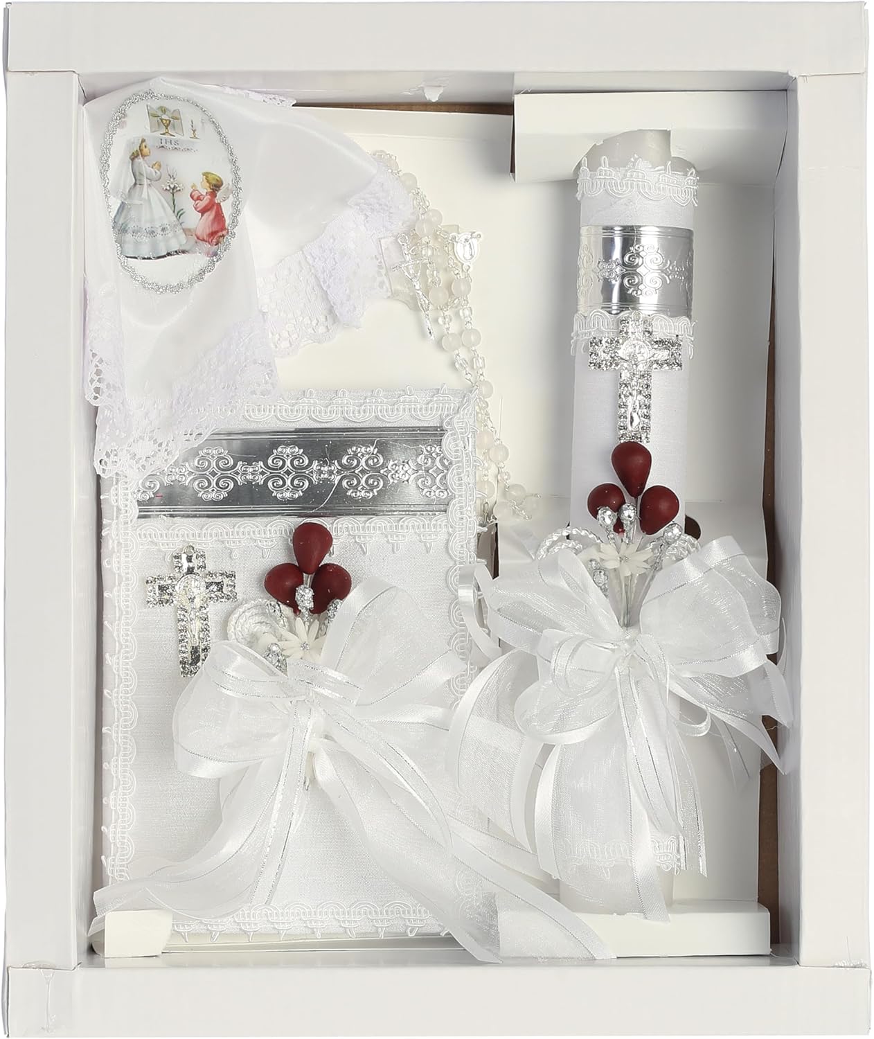 This first communion candle set for girl comes with 4 pieces: a communion candle, a ENGLISH New Testament Bible, rosary, and a white handkerchief with gold embellishment. The communion candle is 10 inches long comes with a beautiful silver cross with Jesus on it, burgundy grapes, and a pretty white bow with flowers and rhinestones. The 1st communion bible is 4 1/2" X 6 1/2" and with a beautiful silver boarder, silver cross, burgundy grapes, & a pretty white bow w/ flowers & rhinestones. The clear rosary with cross matches the set well. The communion white handkerchief features two children praying in front of an altar with silver embellishment. Makes a great gift from the Godmother or Godfather. Velas para primera comunion, velo para primera comunión, vela primera comunion niñas, libro y rosario y vela para primera comunion candle first communion candles with crosses vela de primera comunion para niño velas de primera velas para primera comunion de niños first communion gift set velas de primera comunion catholic 1st communion gifts first communion gifts set religious candles catholic candles cross candle 1st holy communion gifts for girls first holy communion gifts for girls catholic gift set velas de primera comunion para niñas vela para primera comunion para niña velos para niñas de primera comunion first communion set for girl fist communion sets girl