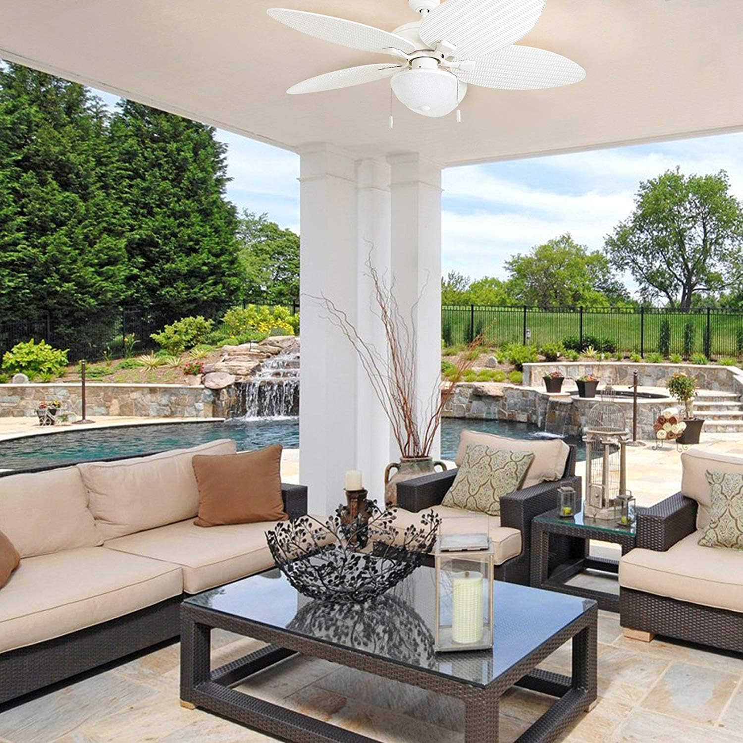 Honeywell ceiling fans make your home comfortable in summer (and winter) as well as help to reduce energy costs. Enjoy the welcome breeze in any room of your home while looking stylish. This tropical multi-position indoor/outdoor ceiling fan provides a truly inspiring fixture for your home. Featuring a glass bowl shade with a white scavo finish The innovative 5-blade design provides ultra-efficient, adjustable and energy efficient airflow while the LED lights provide ideal lighting for the area. Control your ceiling fan with the traditional pull chain. Enjoy year-round comfort by adjusting the reversible airflow switch that easily allows you to change the direction of the fan to properly distribute air. During hot summer months it will provide a cooling effect or when reversed, spreading warm air in the winter to help reduce energy costs. Specifications: Sizing: 52-in 5-blade indoor fan for rooms up to 400 sq. ft. Lighting: 2 x A15 / E26 light bulbs included that provide 600 lumens, 6.5watts, 3000k color temperature. About Honeywell Ceiling Fans Honeywell Ceiling Fans features a collection of fans in various sizes and specifications to ensure your choice of indoor or outdoor fan delivers optimum performance for your room's size. You can trust the quality of Honeywell Ceiling Fans to deliver maximum airflow and a stylish lighting option. Honeywell Ceiling Fans use high-quality materials that are long lasting and durable to deliver a great look and last for years to come.