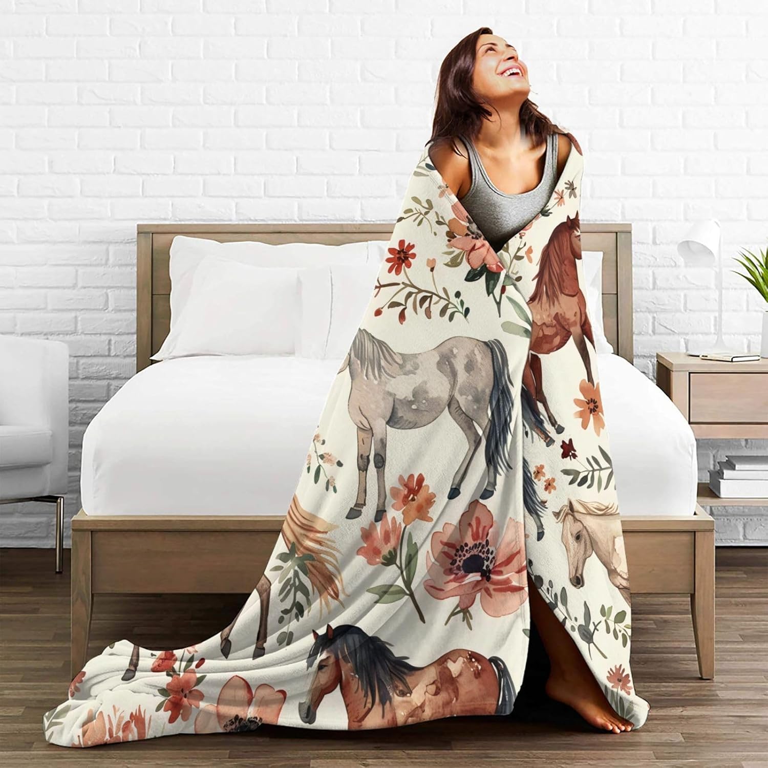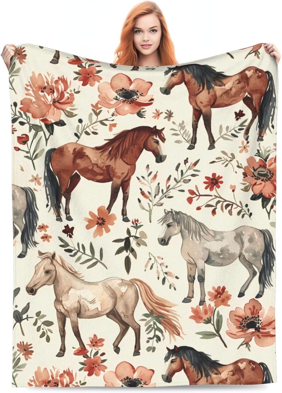 Horse Blanket Horses Flower Decor Animal Throw Blanket Gifts for Girls Boys Super Warm Soft Plush Lightweight Fleece Flannel Winter Bedding Blankets for Kids Adults Women Men 80"X60"