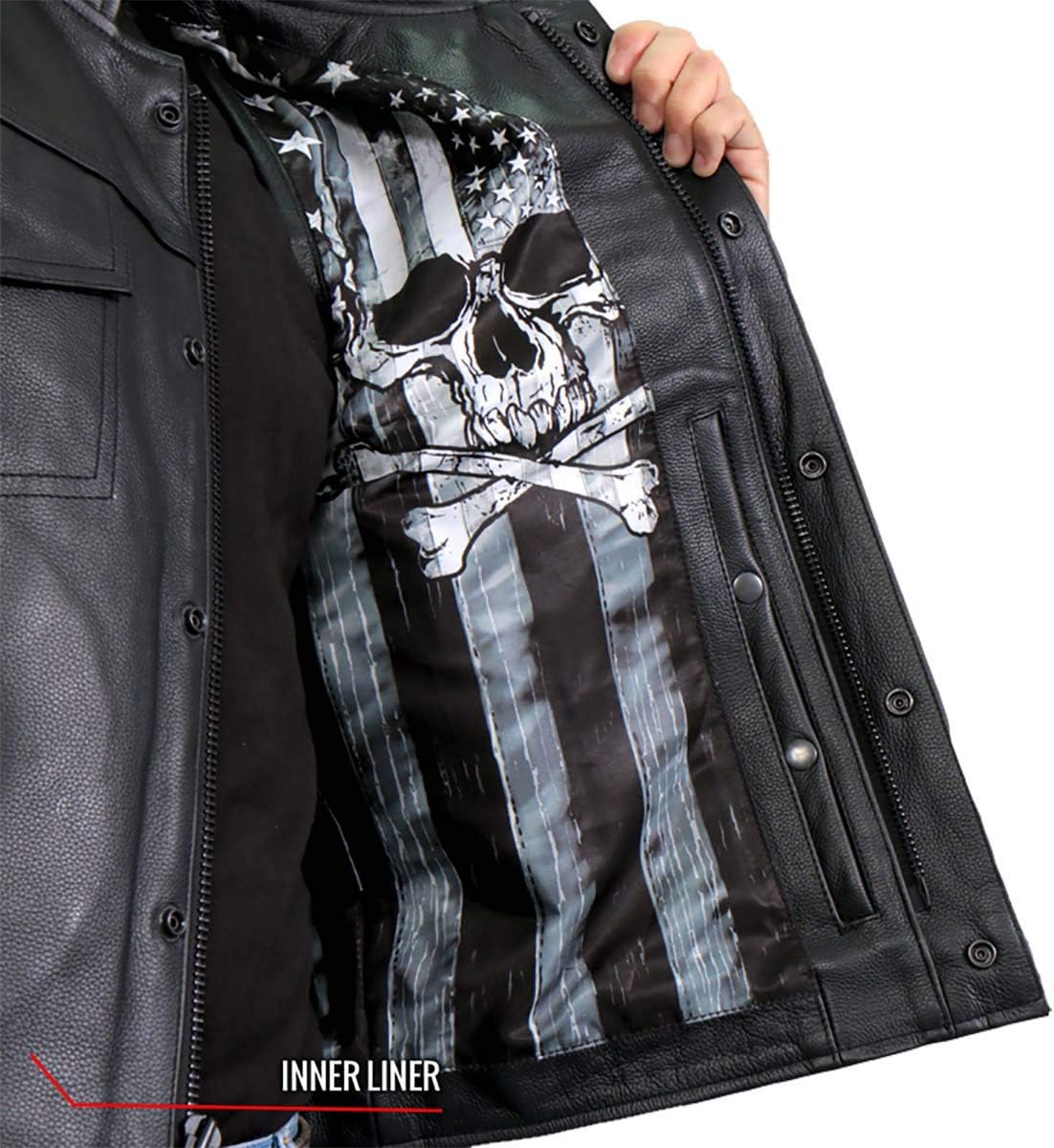 Hot Leathers VSM1054 Men’s Black 'Skull Flag' Conceal and Carry Leather Vest Outside FeaturesMade from Premium Heavyweight Cowhide LeatherStand-Up Collar DesignDual Zipper and Hidden Snap Button Closure2 Outside Lower Hand Pockets with Zipper Closure2 Chest Pockets with Hidden Snap Button Closure (Left Pocket Has a Slit for Your Eyewear)One Piece Back with No Seams Which Is Great for Club Patches or Embroidery ArtworkBlack Color HardwareGenuine YKK Zippers - Known for Longevity and DurabilityInside FeaturesConceal Your Piece with Dual Inside Left and Right Gun or Ammo PocketsInside Right Storage Pocket with Zipper ClosureFull Printed Skull Flag Inside Polyester LiningRide Fast - Live Hard with Hot Leathers Apparel Hot Leathers Is Proud To Announce Of New Collection Of Leather Riding Vests With Full Graphic Printed Lining. This Hot Leathers Motorcycle Club Style Vest Is Built Using Heavyweight Cowhide, Has A Full Zippered Front and Black YKK Hidden Snaps. This Vest Features a Multi Color Polyester Printed Lining Using the Art from Our Classic Skull Flag Design. This Vest Features Four Outside Pockets, Two Carry Conceal Pockets and One Zippered Media Pocket. 7 Pockets! It Features A One Piece Back with No Seams Which Is Great for Stitching Large Patches On.