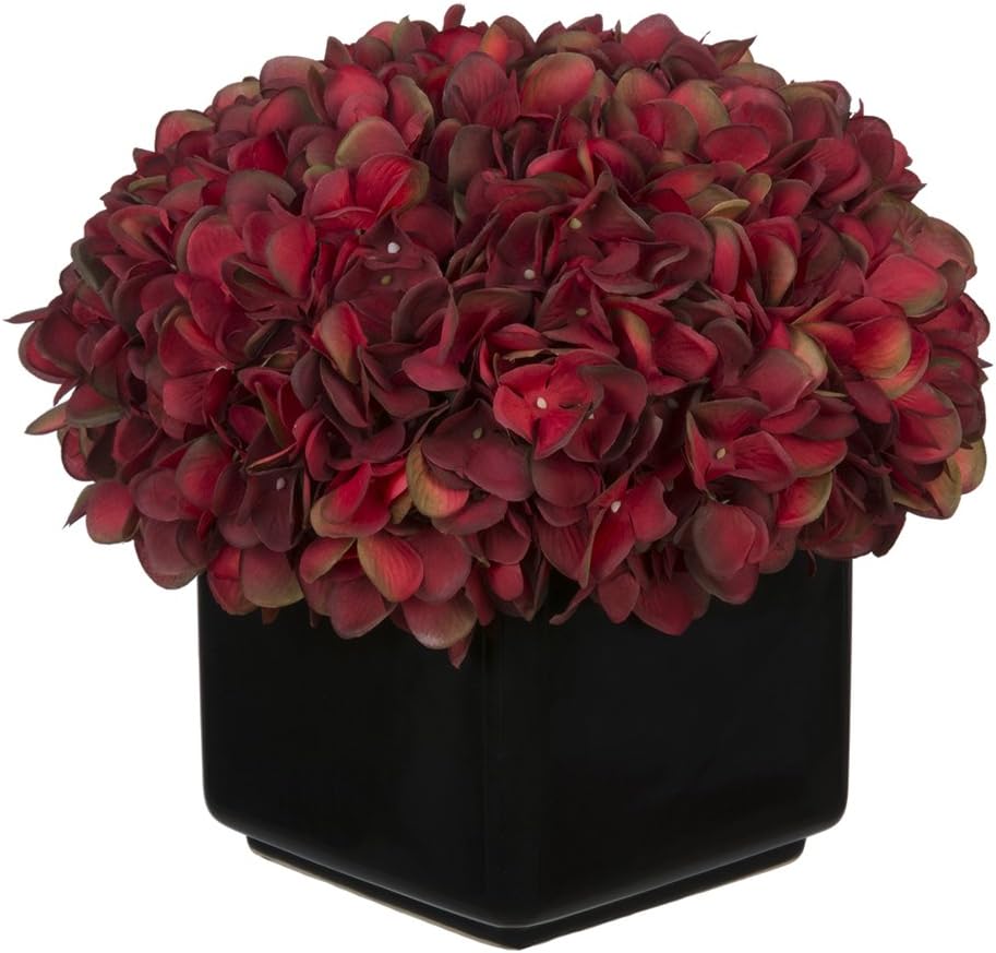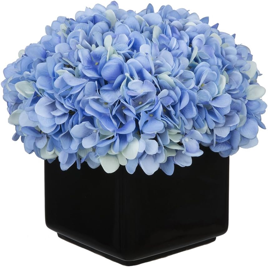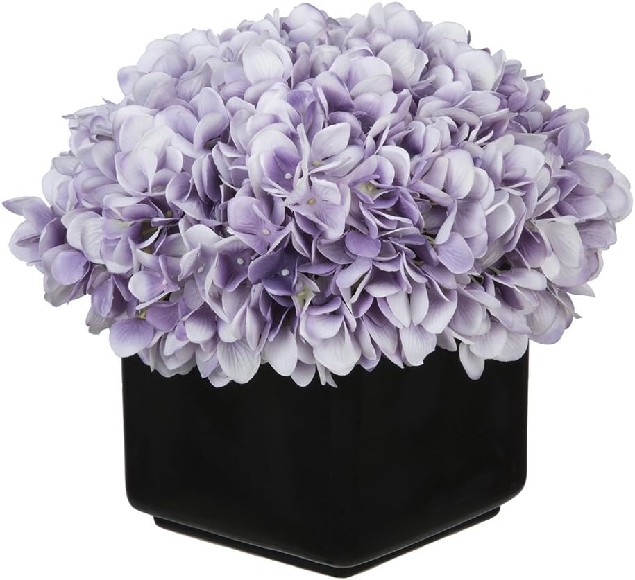 This artificial hydrangea arrangement will add color and life to any spot in your home or office. The hydrangeas are securely "potted" in a contemporary gloss black ceramic cube measuring 6" x 6" x 6" tall. The overall dimensions are measured flower tip to leaf tip, base of vase to tallest flower tip: 9" tall X 10" square. Measurements are approximate, and will be determined by your final shaping of the plant upon unpacking it. No arranging is necessary, only minor shaping, with the way in which we package and ship our products. This product is only recommended for indoor use.