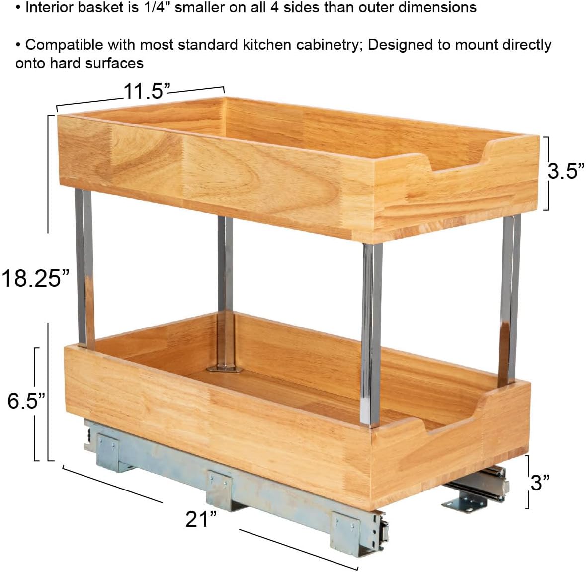 This innovative organizer combines the durability of steel with the natural beauty of wood, providing a stylish and functional storage solution for any kitchen. With its two-tier design and easy-mount full-extension ball-bearing sliding base, it offers ample storage space and convenient access to essentials. This organizer features two tiers of storage space, allowing you to neatly store a variety of items, from cans and dry goods to cleaning essentials. Compatible with most standard kitchen cabinetry, it can be easily mounted directly onto hard surfaces, providing a secure and stable storage solution tailored to any need. Crafted from high-quality wood and steel, this organizer is built to last. The durable powder coating enhances the strength and resilience of the steel, while the natural wood adds a touch of warmth and sophistication. The simple installation process is made even easier with the included mounting hardware.