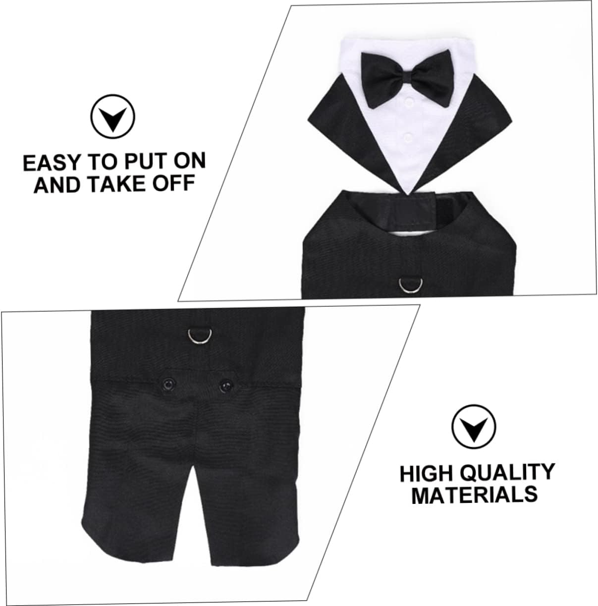 Package Include 3 x tuxedo suit Characteristics - Size L: 53-65cm/20.9-25.6inch(Bust); 38-46cm/14.9-18.1inch(Neck Circumference); 42cm/16.5inch(Back Length) Pet Wedding Tuxedo. - Color: Black, white Pet Garment. - Size XL: 65-80cm/25.6-31.5inch(Bust); 46-54cm/18.1-21.3inch(Neck Circumference); 51cm/20.1inch(Back Length) Dog Tuxedo. - Size S: 32-42cm/12.6-16.5inch(Bust); 27-32cm/10.6-12.6inch(Neck Circumference); 29cm/11.4inch(Back Length) Dog Formal Suit. - Size XXL: 80-90cm/31.5-35.4inch(Bust); 54-64cm/21.3-25.2inch(Neck Circumference); 60cm/23.6inch(Back Length) Dog Wear. - Size : 42-53cm/16.5-20.9inch(Bust); 32-38cm/12.6-14.9inch(Neck Circumference); 35cm/13.8inch(Back Length) Pet Formal Wear. - Material: Cotton Pet Outfits for Dogs. - This tuxedo suit is made of material which is and comfortable Pet Wedding Suit. - The nice workmanship and suit style will make your pet become more attractive Pet Costume. - Great for special occasion and weekend party, weddings, New Year's Eve, Valentine's Day, special occasions Pet Suit. - Classical formal tuxedo suit color with bow tie and decorative buttons brings nobility and elegance Elegant Pet Suit. - Wearing it, your pet dog will be more eye-catching, charming and Clothing.Goods DescriptionPet Wedding Tuxedo This dog suit costume is made by the material for your little pet comfortable wearing, which looks charm and adorable.Pet Formal Wear The stylish gentleman suit design with comfortable texture will practicability and popularity among small dogs