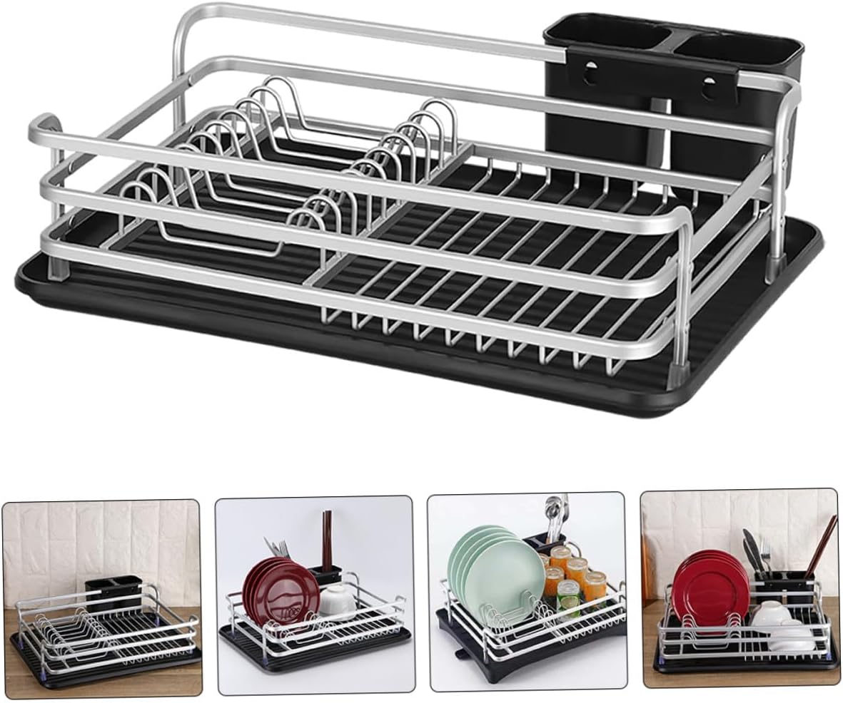 Package List 1 x Dish Rack Features -Product Info:Dish rack -Color:Black -Material:Aluminum,Plastic -Size:42.00X30.00X14.00cm/16.51X11.79X5.50in - Kitchen utensils and cutlery rack can keep your items on the cabinets or countertop clean and tidy kitchen utensil rack. - Proper height of this dish rack will store the bowl solidly, so the bowls and dishes won't fall easily vertical dish drying rack. - Made from with good craftsmanship, this dish drying rack can support long servicing time. - With draining plate on the bottom, the drying rack for kitchen counter can keep your dishes cleaner, avoid water remaining dishwashing rack. - The compartment slot design separates the items so that the needed plates and bowls can be easily accessed tableware storage rack.Goods Descriptionkitchen dish drying rack Avoid accumulating water by the drainage plate design.plate drying rack The large capacity makes this dish rack can accommodate most cutlery.dish drainer rack This is a kitchen dish drying rack which is perfect for storing bowl, fruit and dishes.kitchen draining rack Adopting with craftsmanship, can be used for a long time