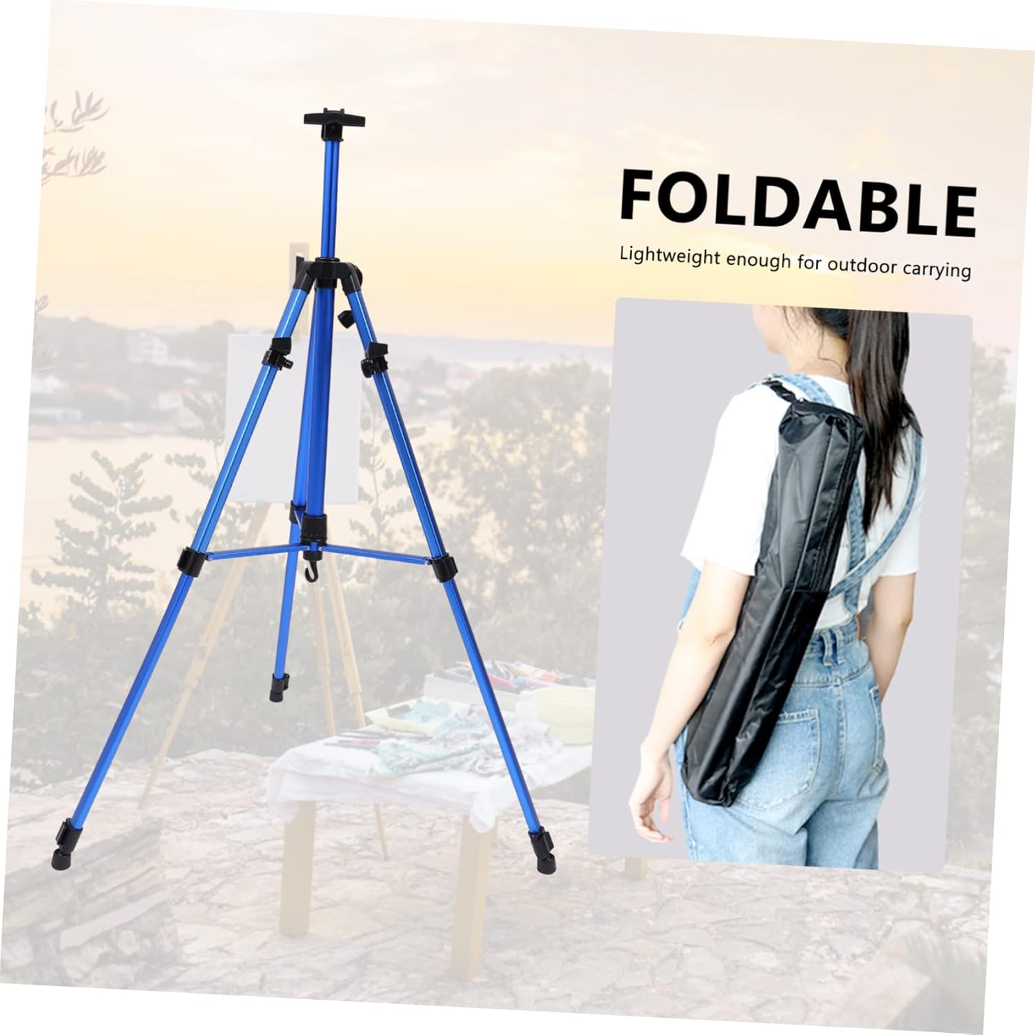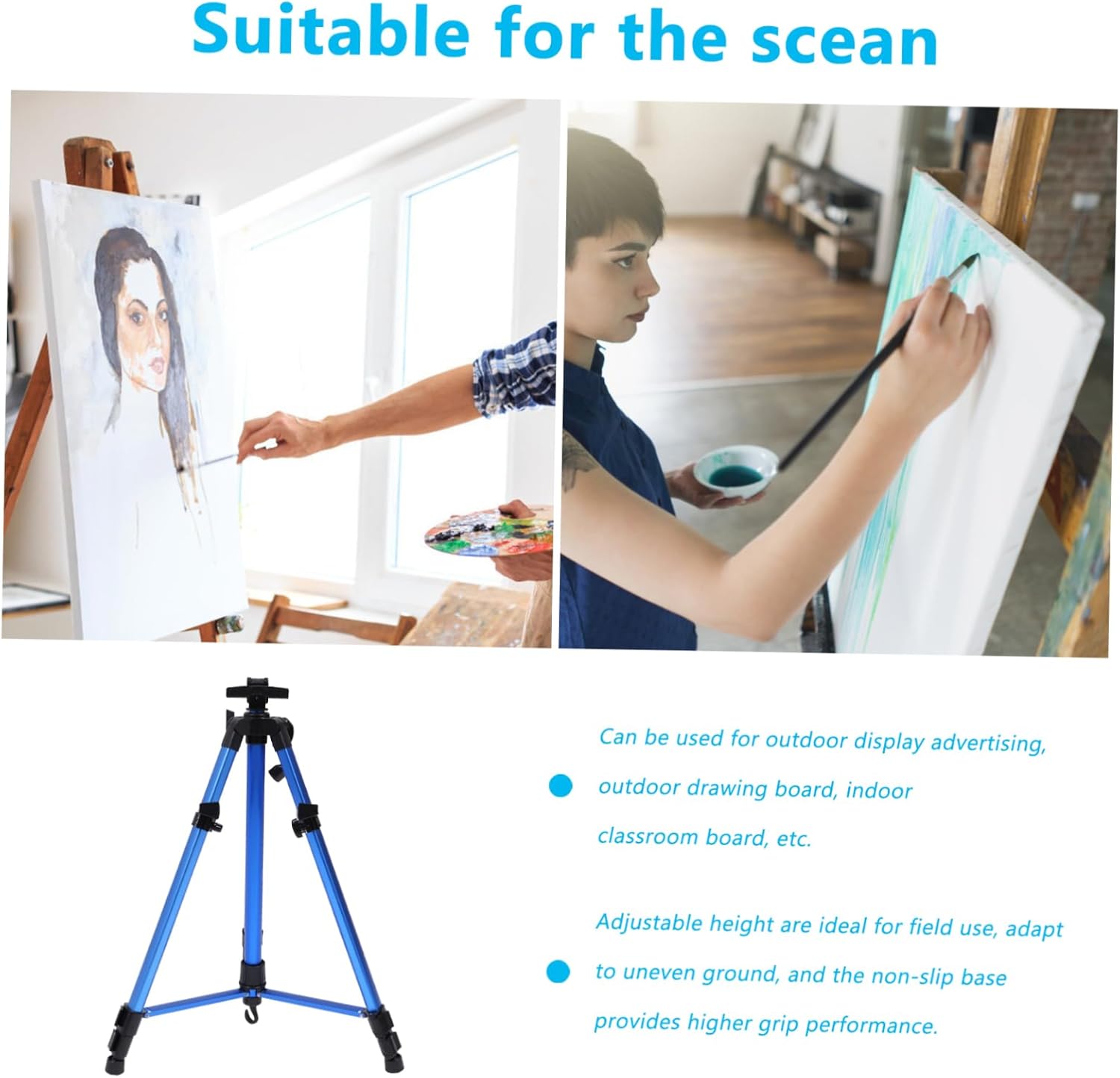 Package List 1 x Easel Stand Characteristics -Material: Aluminum alloy portable easel stand -Size:153.00X82.50X82.50cm/60.13X32.42X32.42in tripod drawing stand -Color: Random color easels for painting canvas - The material is very sturdy, foldable, convenient for transportation outdoor use, perfect to carry painting easel. - Can be used for outdoor display advertising, outdoor drawing board, indoor classroom board, etc canvas easel stand. - Using lightweight and durable aluminum alloy to ensure the stability of canvas tripod display easel stand. - Great for painting, sketching or just used as a display stand foldable artist easel. - Adjustable height are for field use, adapt to uneven ground, and the non-slip base provides higher grip performance aluminum drawing holder. - About 152cm after raising, and about 51cm after outdoor easel.Goods Descriptioneasels for painting Adjustable height is for field use, adapt to uneven ground, and the non-slip base provides higher grip performance.tripod display easel stand This artist foldable easel is suitable for table drawing, sketching, or painting, especially it is great for artists and students who enjoy drawing and painting outdoors and in the