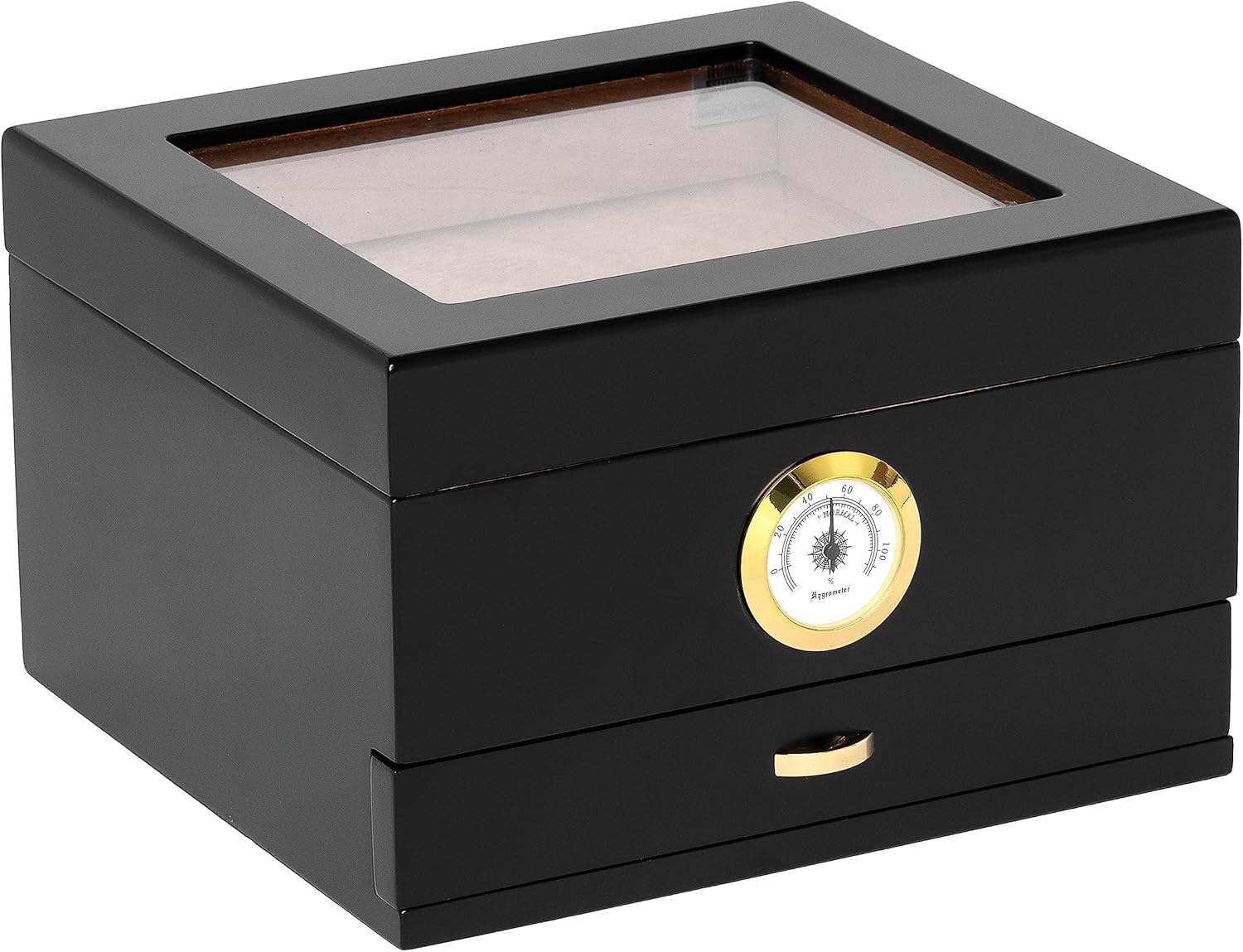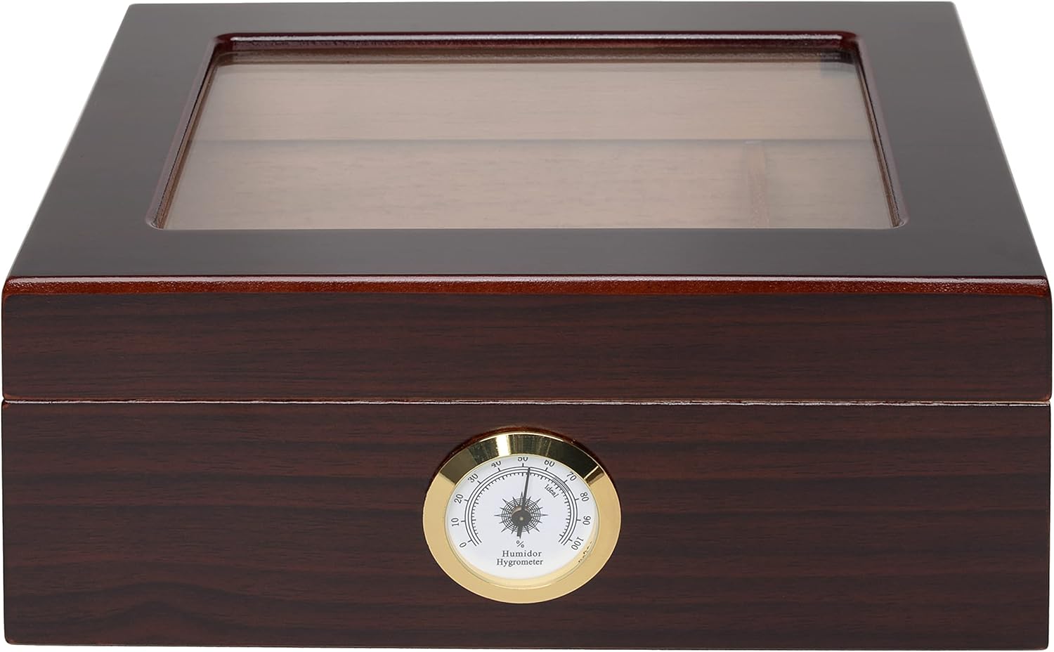 The Capri glasstop desktop cigar humidor comes completely lined with premium kiln-dried Spanish cedar and features Quality importer's SureSeal technology to ensure proper lid seal on closure. It has a scratch-resistant felt-lined bottom, gold-plated hidden quadrant hinges, engravable brass nameplate and one round humidifier (unless otherwise noted). This elegant humidor holds between 25 and 50 cigars and it helps to control the humidity within the cigar box. The right amount of moisture of each cigar delivers maximum cigar puffing experience. The Capri glasstop humidor is the most popular cigar accessory among novice and experienced cigar smokers.
