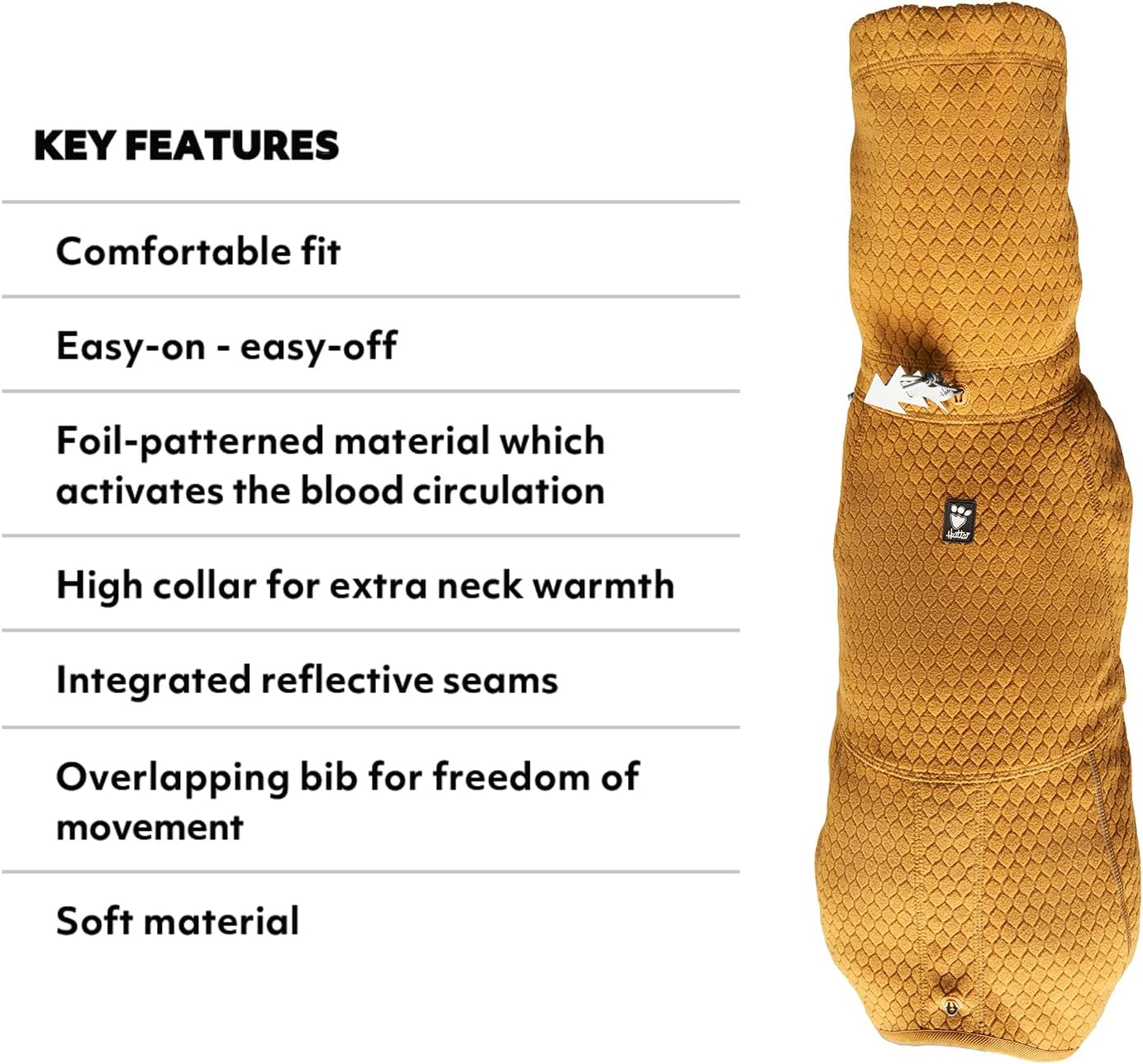 The soft and comfy Midlayer ECO dog jacket is a lifesaver in cold and chilly weather. It’s now even warmer thanks to the addition of a unique foil jersey warming lining that you may recognize from another Hurtta favorite, the cold-busting Extreme Warmer. Another feature you’ll love in this jacket is the front leg openings which give the dog extra room to move more freely. Sporting and active dogs in particular will benefit greatly from wearing a warming jacket. It's important to keep your dog’s muscles soft and warm when waiting between agility or obedience training sessions and performances. Extra warming is important for older dogs too. It helps soothe aching joints and make moving around easier. The outer fabric of the Warming Midlayer ECO pullover is a soft, recycled ECO honeycomb fleece. The inner layer features the warming foil jersey lining which has proven to be a very functional and trusted material among dog lovers. The foil lining actively reflects the dog's body heat back to the dog, making it an effective heater. The soft materials are virtually rustle-free, making the jacket suitable for dogs that are sensitive to noisy sounds. The Warming Midlayer ECO dog jacket is also an excellent choice as a first garment for dogs who are not accustomed to wearing apparel.