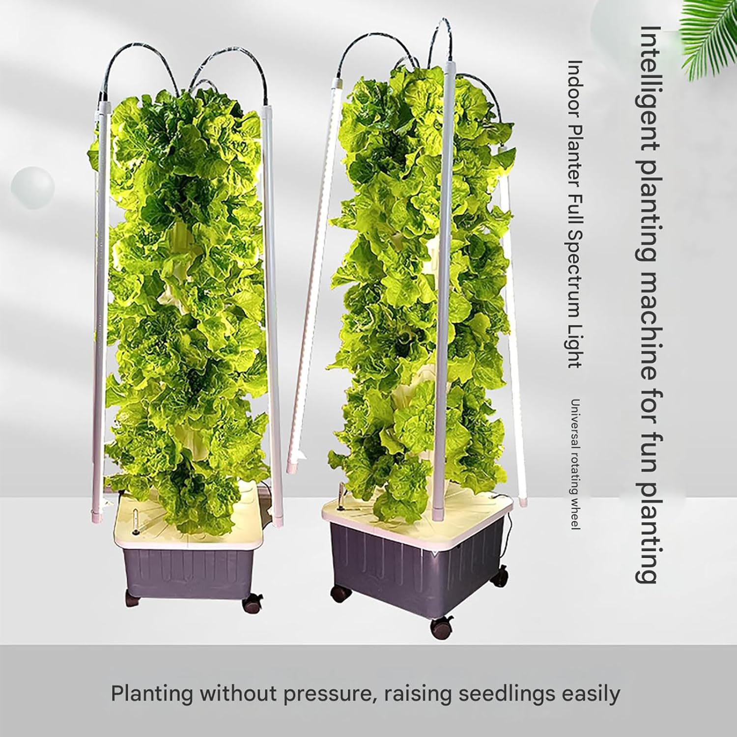 Hydroponic Tower, 8-Layer Vertical Planter Tower, Hydroponics Growing System Kit, Food Grade with 40 Pods, LED Grow Lights DESCRIPTION: This hydroponic system garden plant system is very easy to install and operate, very suitable for beginners! Maintenance is simple, no plowing is required. Place this hydroponic growing system indoors and plant and harvest all year round, regardless of the weather. The three-dimensional vertical design takes up little space and has a beautiful appearance, making it suitable for any place. It can be used for both planting and decoration. Our vertical farming towers are suitable for home balconies, rooftop courtyards, restaurants, community vegetable gardens, farms, campus science popularization, etc. FEATURES: - Silent low-pressure water pump - Small area, large planting - One-button smart planting - With fill light tube - Water level can be observed - Universal rotating wheels at the bottom PARAMETERS: Product name: Intelligent hydroponics growing system tower Size: 405×405×1550MM Power: 135W Voltage: 24V Net weight: 6.5KG Planting quantity: 40 (5 per layer, 8 layers in total) WARM TIPS The product parameters are all measured manually, which will lead to slight differences in size, please understand.