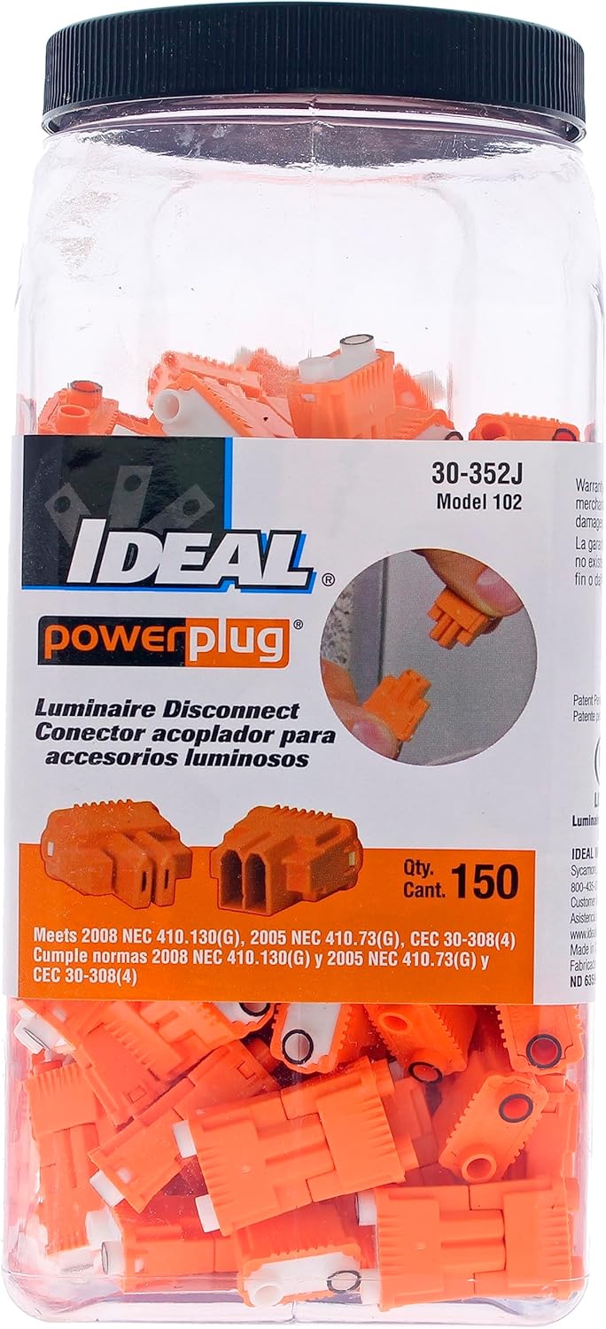 Product Description The PowerPlug features patented IDEAL push-in technology that quickly locks wires in place. It helps reduce electrical shock hazard during ballast replacement by safely disconnecting hot and neutral ballast wiring while offering additional safety since both halves meet UL and CSA finger-probe safety requirements. The entire family easily fits through 1/2 in. knockouts for quick installation. Available in 2-pole, 3-pole and 2-pole plus ground models, the PowerPlug provides fast, efficient luminaire connections resulting in reduced installation time and improved labor savings. From the Manufacturer In 1916, J. Walter Becker started the Ideal Commutator Dresser Company of Chicago from his mother's kitchen. He manufactured commutator dresser stones with the belief that every product should be worth more than the price paid for it. Service, he said, was part of the product. That idea has been the core Ideal business principle for over 90 years. Today, the many loyal distributors and customers that make Ideal successful are a testament to Becker's original philosophy. The Ideal 30-352J Power Plug meets CEC and NEC code changes for non-residential fluorescent luminaries with ballasts and is perfect for OEM or retrofit lighting applications. It has a patented push-in technology that quickly locks wires in place. Also it fits through a 1/2-Inch knockout and the pieces pull apart safely and easily. Another convenient characteristic of the Power Plug is the thumb ridges that provide superior grip.