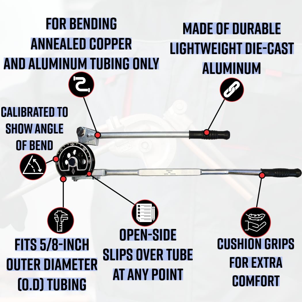 5/8" O.D. lever tube bender. Open-side type which slips over tube at any point. Makes smooth, tight radius bends up to 180° with minimum effort. No scoring or flattening of tubing. Calibrated to show angle of bend. Wide hook grips tubing securely.