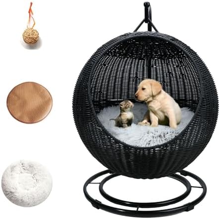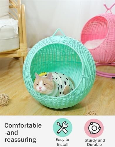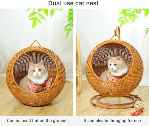 Introducing our Simple Handwoven Cat Nest, a versatile pet hanging basket that serves as both a cozy retreat for your furry friend and a charming addition to your home decor. With generous dimensions of 26 x 17 x 17 inches, this spacious hammock is perfect for cats, small dogs, rabbits, and other small pets, providing a comfortable space for them to relax and play. Crafted from durable imitation rattan and iron, this cat hammock guarantees quality and longevity. The package includes a soft cotton pad, a mat for added comfort, and a toy ball to keep your pet entertained. Assembly is a breeze—simply connect the support bar to the round base using the included screws, then hang the wicker basket in seconds, making it an effortless addition to your living space. Designed with stability in mind, our cat bed features a robust base and sturdy brackets, ensuring a secure experience for your pet. While some gentle swaying is normal in a hammock, your cat will feel safe and secure as they enter and exit through the large-caliber outlet. This hanging cat bed is perfect for both indoor and outdoor use. Set it up in your living room, bedroom, or study, or take it outside to your porch or garden. It provides an ideal space for your pet to play, jump, and soak up the sun, enhancing their overall well-being. We are committed to your satisfaction. If you have any questions or concerns, our support team is available to assist you within 24 hours. Experience the joy and comfort our Simple Handwoven Cat Nest brings to your pet and home today!