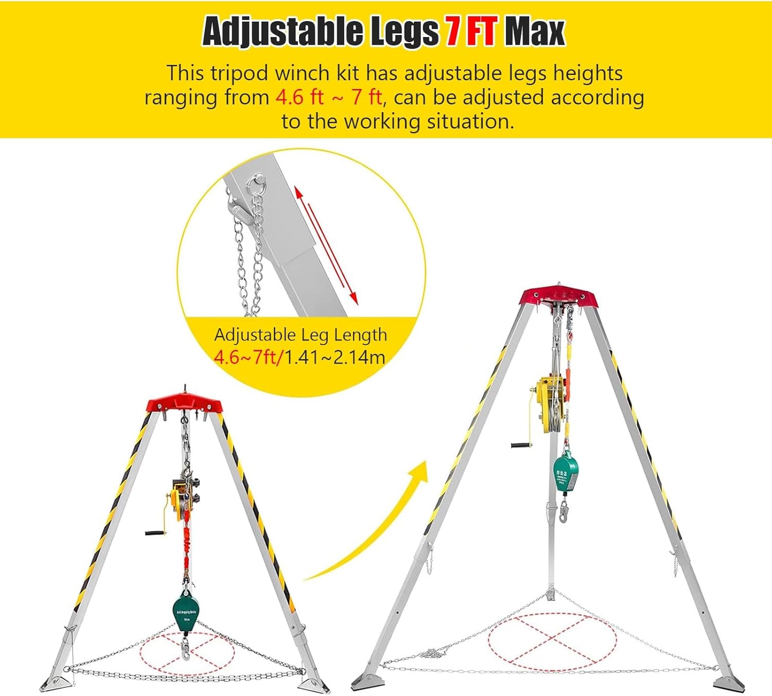**Emergency Firefighting Rescue Rope System: Product Description** Discover our Confined Space Entry Kit, expertly designed for professionals who require reliable access and fall protection in challenging environments such as wells, sewers, tunnels, and other confined spaces. This durable system, constructed from high-quality aluminum alloy, ensures a substantial load capacity and outstanding performance, making it an invaluable tool for safety and efficiency on the job. The kit features a manual winch with an impressive efficiency ratio of 8:1, offering various load-bearing options of 1200LBS, 1800LBS, and 2600LBS to accommodate your specific needs. With a safety factor of 10, you can have peace of mind knowing that your safety is our priority. The adjustable height ranges from 4.6 to 7 feet, providing versatility for different applins and ground conditions. Designed for convenience, our tripod legs are easy to assemble and disassemble, making transportation hassle-free. The self-locking winch and anti-dropping device enhance safety during use, while the adjustable feet allow for secure installation in wellheads and uneven terrains. Whether you're responding to emergencies or conducting maintenance in confined spaces, our Confined Space Entry Kit is a reliable choice that balances strength and portability. Elevate your safety standards and streamline your operations with this essential rescue rope system. **Package Includes:** 1 × Confined Space Tripod Kit + Safety Belt **Note:** Please allow for slight measurement variations and color differences due to lighting and screen settings.