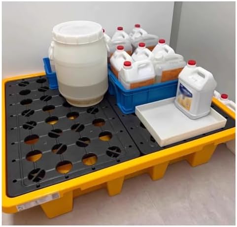 The plastic pallet is crafted from high-density polyethylene (HDPE) material, ensuring durability against wear and tear. It features reinforced ribs at the back, enhancing both the stability of the plastic boards and the load-bearing capacity of the pads. Designed for convenience, the spill containment leakproof tray is detachable, allowing for easy assembly and disassembly as needed. This product is available in various sizes to accommodate different needs, with dimensions including 530x430x110mm, 675x375x120mm, 675x675x120mm, 650x650x170mm, 675x675x150mm, and 680x680x110mm. Its black and yellow color scheme ensures visibility in various settings. Maintenance is straightforward, requiring only a rinse with water. Ideal for a wide range of environments such as warehouses, workshops, maintenance areas, supermarkets, and industrial or commercial factories, this drum spill platform serves as an effective industrial oil drums containment tray with a flat top grating for spill-proof functionality. The package includes one plastic pallet.