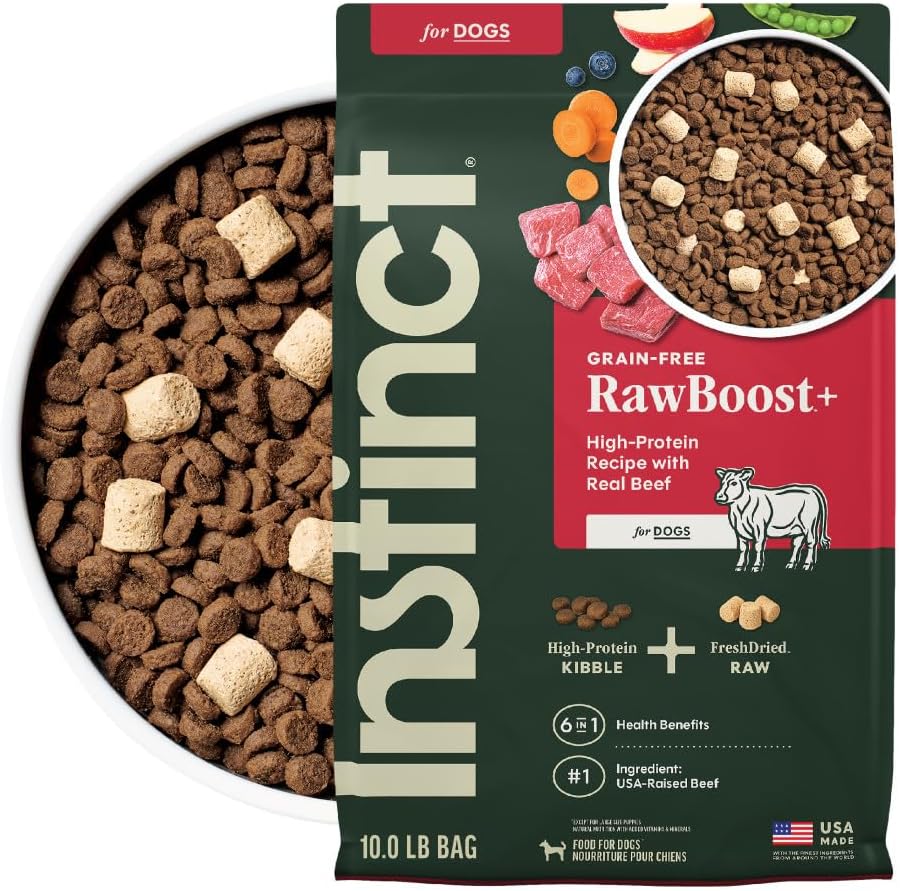 Instinct RawBoost High-Protein Recipe with Real Beef Dry Dog Food is a natural dog food that begins with USA-raised beef as the first ingredient, delivering high-quality animal protein in every bite. This grain free dog food is complemented by nutrient-rich fruits and vegetables for a balanced, wholesome diet. Crafted without fillers, this healthy dog food contains no grain, potato, corn, wheat, soy, by-product meals, artificial colors, or preservatives—ensuring your dog receives only pure, clean nutrition. What makes Instinct RawBoost unique is its blend of crunchy dog kibble with FreshDried Raw dog food. This high protein dog food delivers bold flavor and a variety of textures dogs naturally crave. This innovative dog food blend provides 6-in-1 health benefits—from digestion and immunity to a healthy heart and lean muscles. Proudly made in the USA with the finest ingredients from around the world, Instinct dog food offers complete, balanced nutrition inspired by the power of raw.