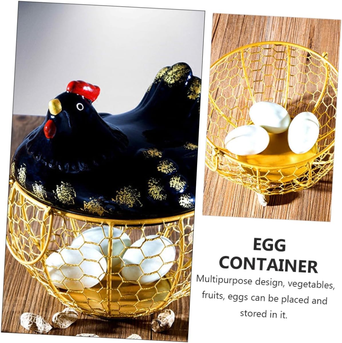Package Include 1 x egg cage Features - Color: Golden, Black. - Size: About 22.00X19.50X19.50cm/8.65X7.66X7.66inch. -Product Info:Iron egg cage - Material: Ceramics, Iron. - Perfect for home, restaurant, buffet, hotel, party and more egg holder storage for kitchen. - It can help keep your kitchen countertop tidy and save space egg storage for kitchen. - This storage basket can help you keep a neat and orderly kitchen metal chicken basket. - It is not only a storage basket, but also a desktop ornament egg display holder. - Made of ceramic, iron, very and reliable for a long period egg shaped basket.Goods Descriptionkitchen storage basket Fine craftsmanship, not easy to deform or break, to use.rustic eggs holder It can also be used as an egg storage basket.egg holders kitchen Simple appearance, smooth and rounded edges, comfortable hand feel.egg nest design This is a storage basket for storing fruits, vegetables, food and more