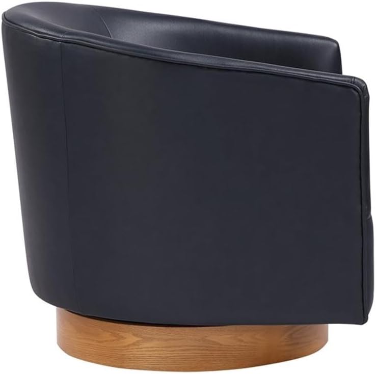 Introducing the Irving Midnight Blue Faux Leather Wood Base Barrel Swivel Chair - the perfect addition to your modern home décor. Featuring a midnight blue faux leather upholstery and brown wooden base, this chair is constructed with a sturdy wood frame and designed to wrap you in ultimate comfort. The Barrel style chair is upholstered in a durable leather gel that is easy to clean and maintain, making it practical for everyday use. The swivel base rotates 360 degrees, allowing for ease of conversation and a comfortable experience for you and your guests. The pocket coil seat cushion is designed for maximum comfort, making this chair perfect for long periods of lounging. And with the sinuous "no sag" springs, this chair will maintain its shape and provide the ultimate support. Upgrade your home décor with the Irving Midnight Blue Faux Leather Wood Base Barrel Swivel Chair today and experience the perfect combination of style and comfort.Features:- Midnight Blue faux leather/brown base- Wood frame construction and faux leather- Modern Barrel style chair upholstered in faux leather- Wooden swivel base finished in brown- 360 degree swivel makes for ease of conversation - does not tilt or rock- Pocket coil seat cushion is comfortable- Upholstered in easy to clean durable leather gel- Barrel style chair wraps you in comfort- Sinuous "no sag" springs- No Assembly Required- Well packaged to arrive safe and soundSpecifications:- Product Dimensions: 28"H x 29"W x 29"D- Product Weight: 49 lbs.- Seat Dimensions: 18.75"H x 22.5"W x 21"D- Arm Height: 23"H