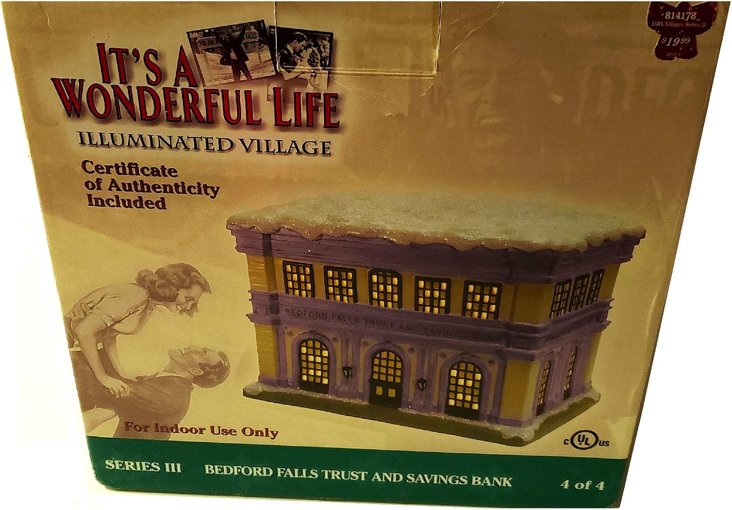 This is the Bedford Falls Trust and Savings Bank building. #4 of 4 from series III. It is in excellent condition. Lights up well. Has original box, COA and packaging. Originally issued by Target as their It's a Wonderful Holiday line honoring the Christmas movie, It's a Wonderful Life. This 1946 classic comes to life in a collectible, limited edition village. Includes lighted cord and Certificate of Authenticity. Comes with original box and protective packaging, and original COA. Displayed only once and in LIKE NEW excellent condition! Box shows some wear from storage
