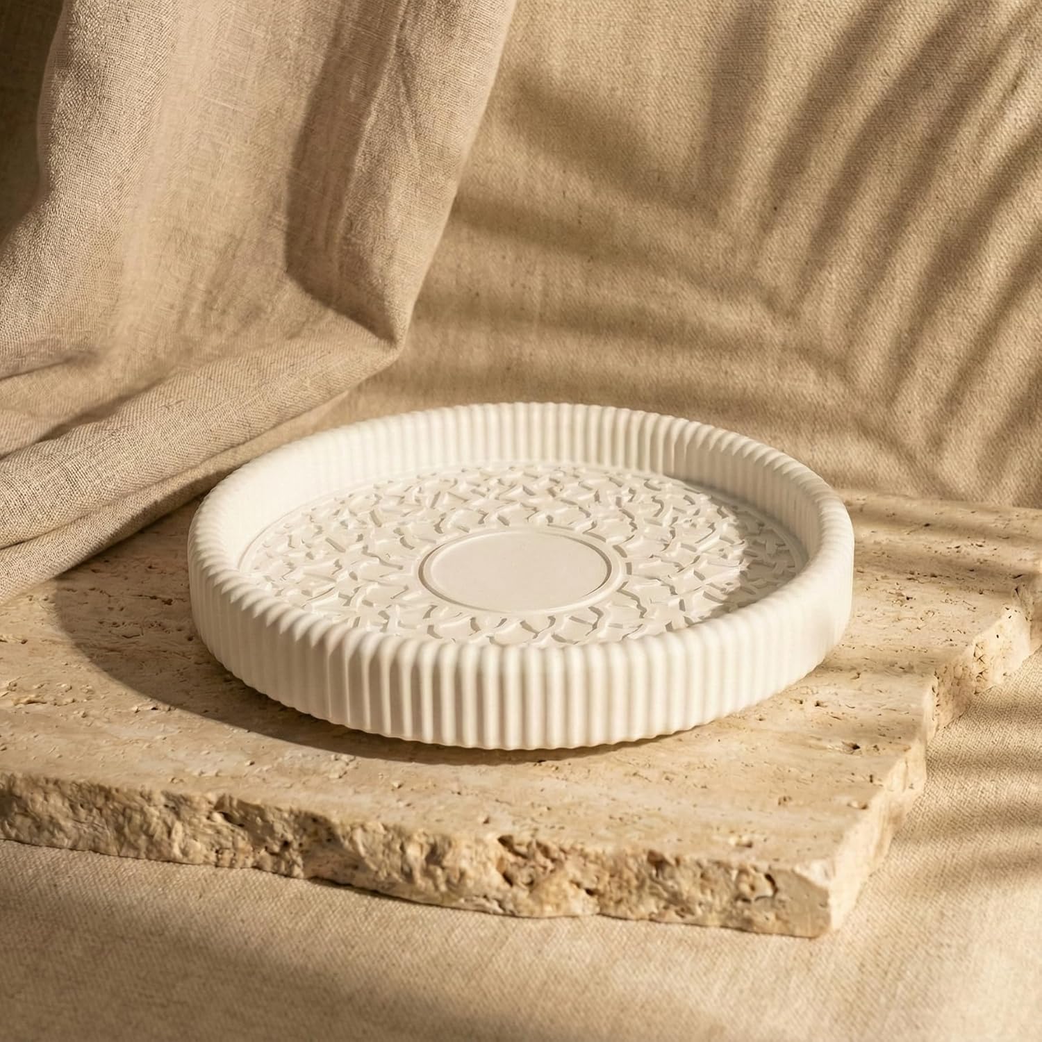 Circular Kufic Basmala Geometric Decorative Tray, Islamic Tabletop Stone Tray, White Minimal Islamic Home Decor, Ramadan & Eid Gift