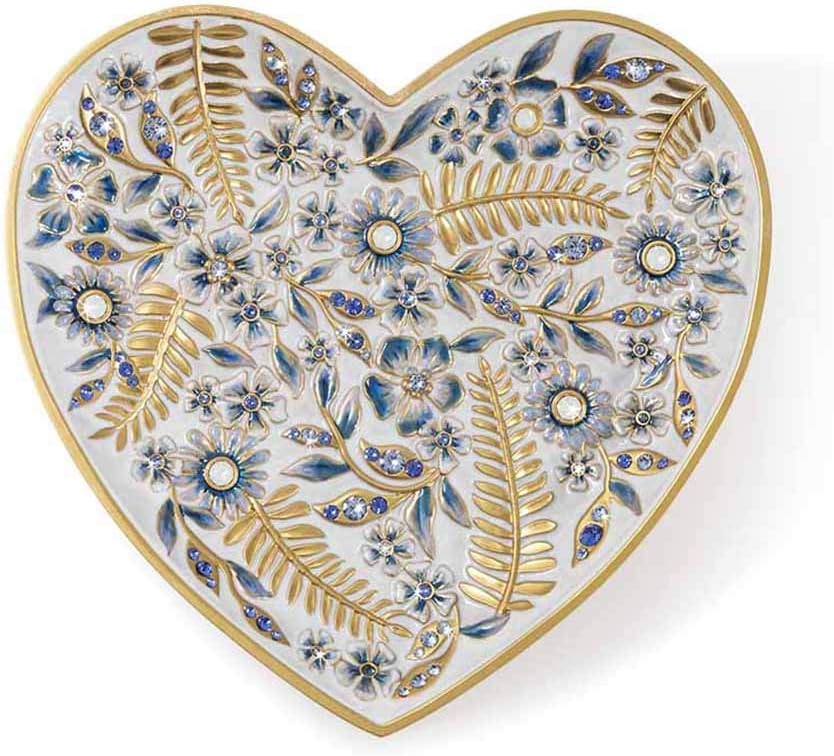 A field of delicate fern leaves and flowers etched on our romantic Aria Floral Heart Trinket Tray in the always compelling blue & white colorway. Watercolor shades of hand-painted cobalt enamels highlight the flora set on a creamy white background on this pewter tray finished in 18K gold – the underside finished in translucent navy enamel. Hand-set with Swarovski White Opal and Sapphire crystals. Materials: Pewter with a 18K gold finish with polished highlights, hand-enameled and hand-set with Swarovski crystals. Imported. Dimensions: 5.5” W x 4.75” D x .75” H Jay Strongwater's designs are rooted in jewelry making and are reminiscent of beautiful, old-world opulence. Each piece is meticulously hand made and bejeweled with semi-precious stones, often requiring weeks to complete. All Jay Strongwater pieces are expertly handcrafted and are of exceptional, heirloom quality. Learn more about Jay Strongwater.