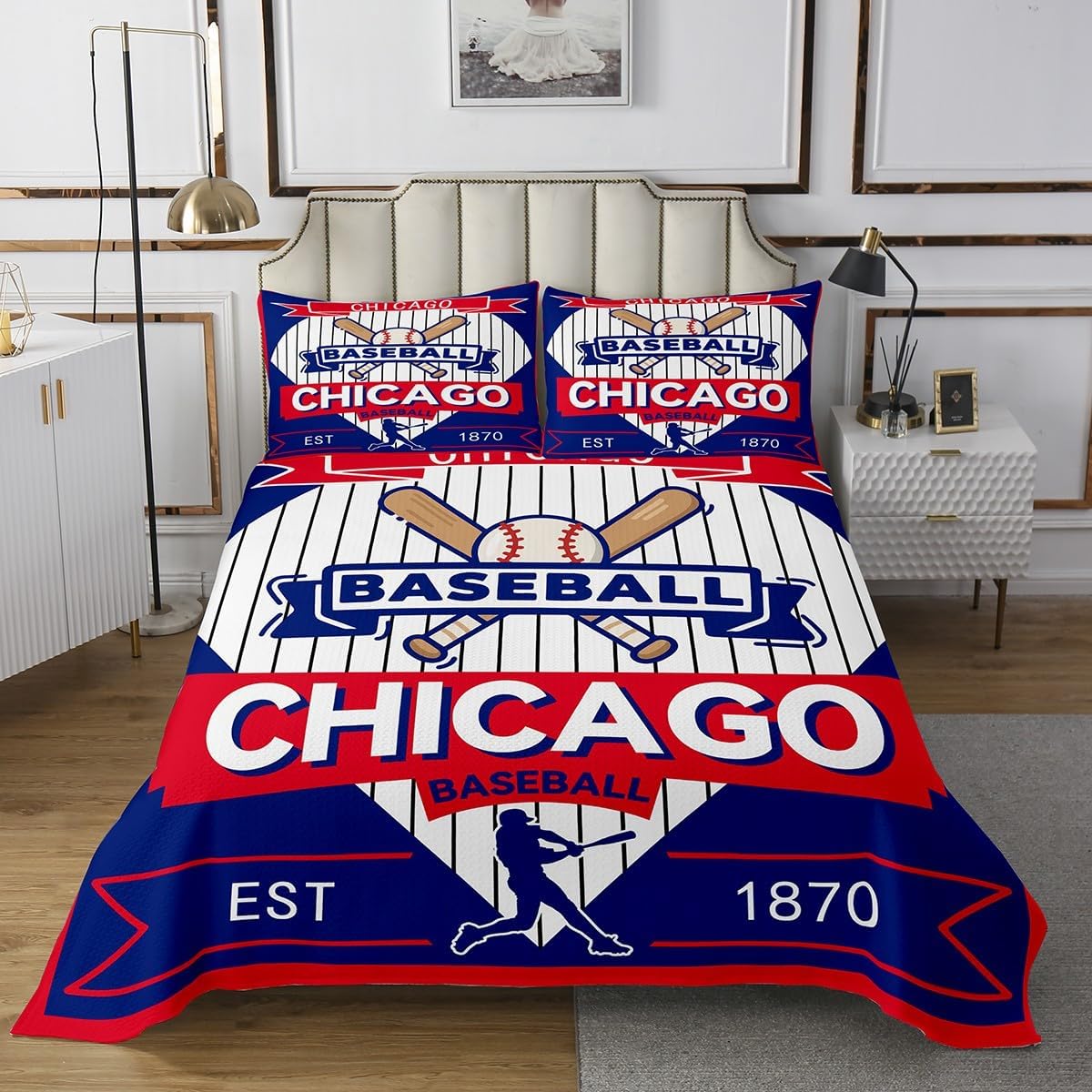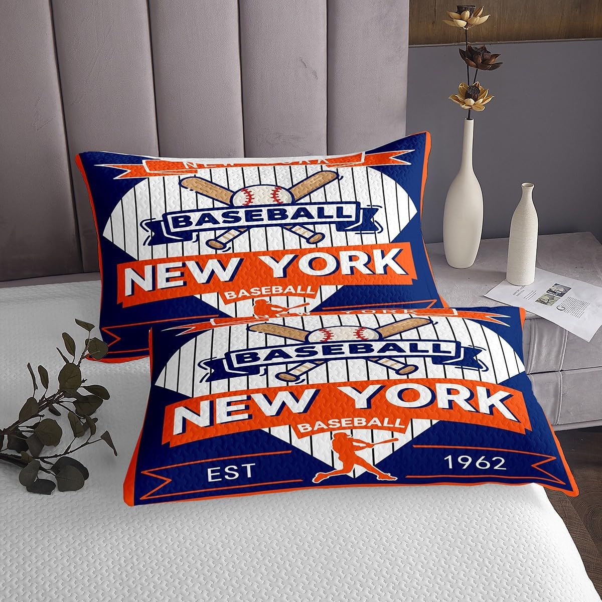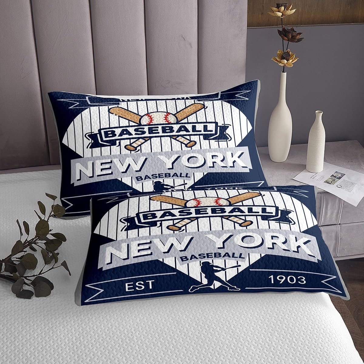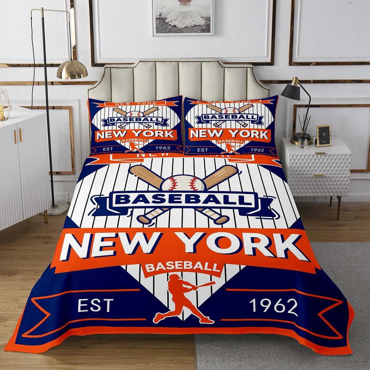 jejeloiu Baseball Bedspread Queen Size New York Coverlet Set Baseball City Quilted Coverlet for All Season with 2 Pillowcases Sports Game Microfiber Lightweight