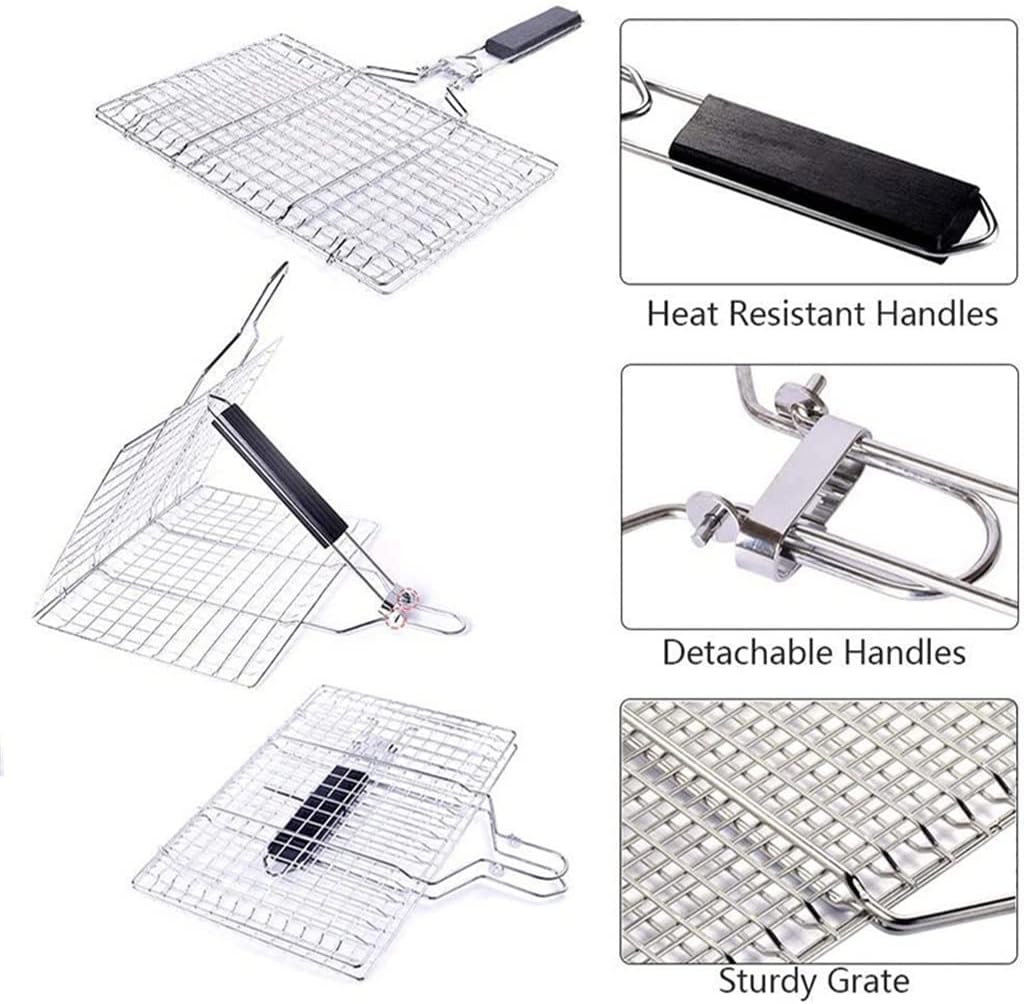 Product Information: The Grill Basket and Basting Brush are made of 430 food-grade stainless steel, which is reusable and strong, also rust resistant for long term use. Large Grilling Surface: This Grilling basket provides a generous cooking surface of 12.99 x 8.66 inch to accommodate foods for 2-3 。Lockable and Grid Gap: Lockable grill basket locks foods in place and promotes easy flipping of grilled foods. The grid gaps are perfectly sized to provide even heat distribution while small pieces of foods from falling through grill basket。Folding and Portable: folding and easy to carry. Take it on weekend and enjoy the delicious BBQ foods(such as fish, shrimp, vegetable, corn, steak and so on) with your friends。Weight of brush is 2.11 ounce and the grill basket is 16.22 ounce。packages:1*grill basketNote:Due to the different monitor and light effect, the actual color of the item might be slightly different from the color showed on the pictures. Thank you!Please allow 1-2cm measuring deviation due to manual measurement.This wooden handle barbecue basket does not stick, so you don't have to worry about the food sticking to it.