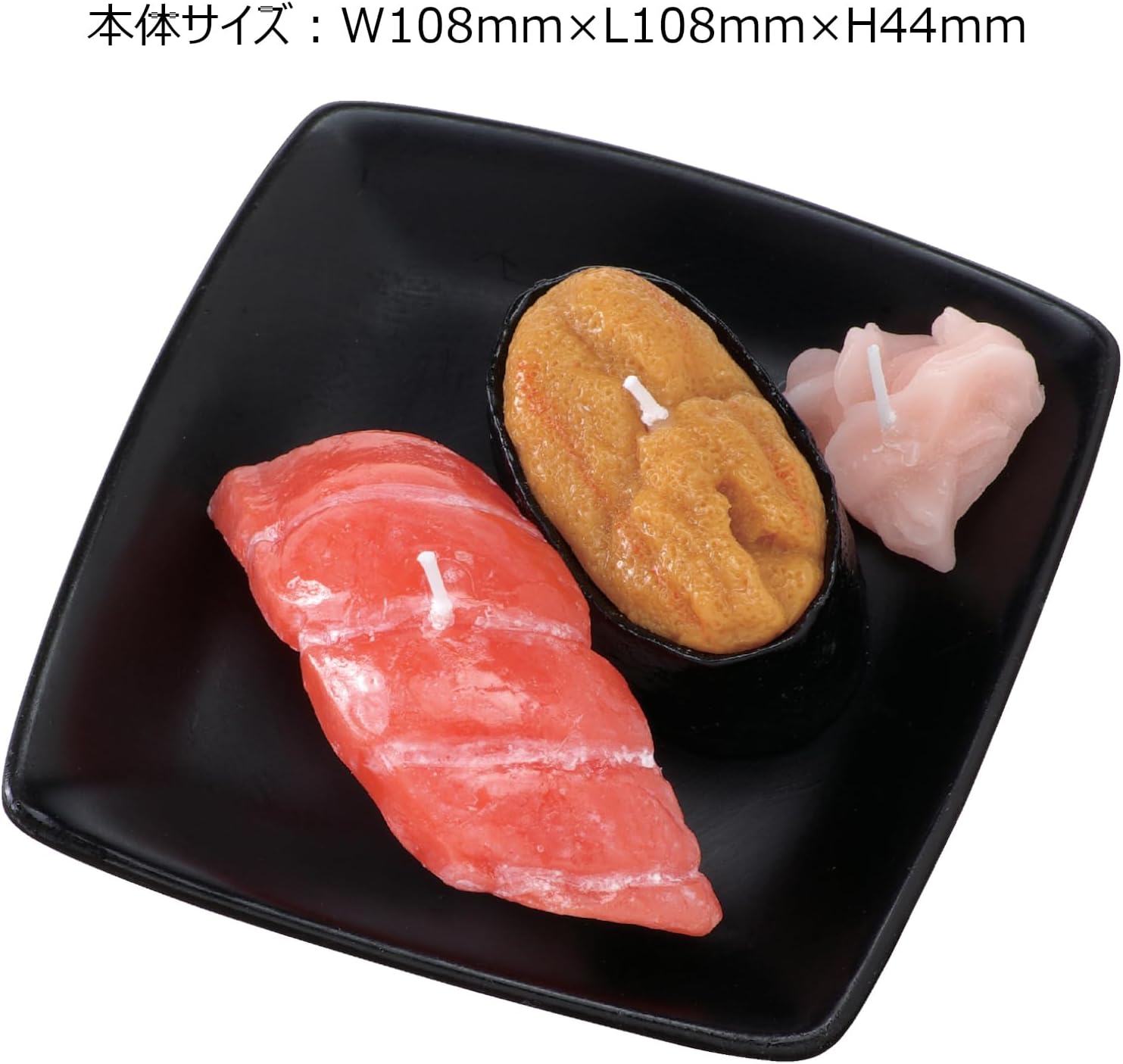 Product includes a set of three candles, including two pieces of fresh mouth-watering Sushi candles (Uni and Toro) and one sushi-ginger candle. A black ceramic plate is included with the candles. As the Toro candle burns, something green which resembles wasabi will also appear! this novelty item is perfect for any Sushi lover! product measures 4.3'' x 4.3'' x 1.7'' and weighs 7.7 oz. Product includes black ceramic plate that candles melts on. Candle burns without any fragrance. Wax material is made from kerosene-free paraffin.