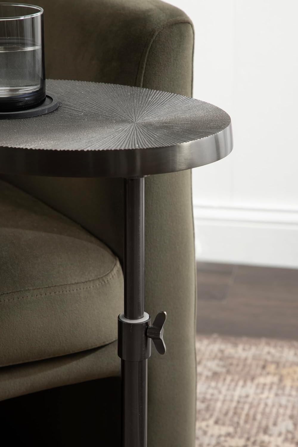 Introducing the Kate and Laurel Engles oval C-table, a stunning piece that combines elegance and functionality. This C-shaped side table is designed to elevate your living space with its sleek yet vintage style. Crafted with a gray gunmetal finish, this table exudes a luxurious charm that complements a variety of decor styles. The unique design of this C-table includes an adjustable-height base to adequately meet the right height for your bedside or your couch. The embossed tabletop adds a touch of opulence, creating a focal point that catches the eye. Its oval shape adds a unique twist to the classic C-table design, making it a standout piece in any room. Not only does the Engles C-Table enhance the aesthetic appeal of your space, but it also serves a practical purpose. The C-shaped design allows you to slide the table effortlessly over your sofa or chair, providing a convenient surface to place your snacks, drinks, or electronic devices. The Engles is not only a stylish accent piece but also a functional addition to your home. Its versatility extends beyond the living room - use it as a bedside table, a plant stand, or even a display table for your favorite decor items. At 15 inches wide by 10 inches deep, this table is a perfect fit for a variety of spaces, especially with its telescope design that can adjust its height anywhere between 22 and 28 inches.