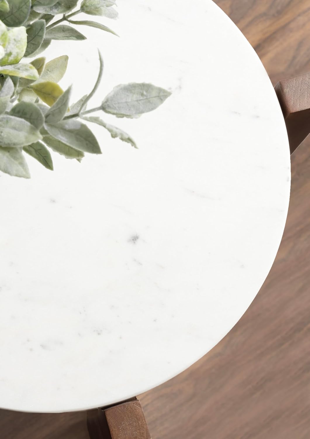 The Moxley is for the transitional modern decorator that craves functionality within their aesthetically-pleasing home. This beautiful side table features two beautiful, authentic marble tabletops for a refined look. Handcrafted in India, each Moxley table contains variations in marble veining, making each piece one-of-a-kind. Your Moxley table also boasts walnut brown wood legs that blend well with almost any space. This end table is the perfect size for flanking your entryway, bed, or couch, measuring 16 inches in diameter by 22 inches tall. Use the top tier as a display surface for decorative accents like a drink with coasters, succulents, an alarm clock, or candles while using the lower shelf to store small household items like books and more. Regardless of where and how you use this beautiful side table, you can rest easy knowing your hardwood or tile floors are protected from damage with the rubber pads attached to each foot. Finally, assemble the stunning Moxley in a matter of minutes with the streamlined 3-step assembly process.
