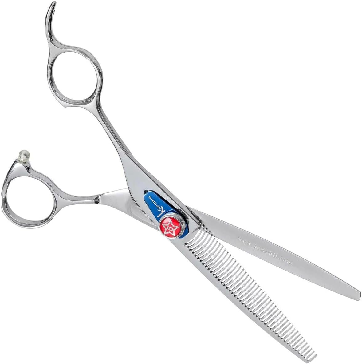 Kenchii is known for creating the best and most innovative grooming tools in the world. They are passionate about producing the best scissors in the world by exploring advanced concepts, fantastic designs and unmatched performance, thus remaining at the forefront of their industry. They don't just raise the bar, they set it. Five Star Range – High quality, superbly balanced scissors made from the finest materials. One of the most popular scissor ranges in the United States. Level 1: Entry-level scissors for students or entry-level groomers Level 2: Workhorse scissors for daily professional use Level 3: Scissors for professionals who take scissors seriously Level 4: Elite Scissors made to an extremely high level 5: Some of the World's Best Scissors Kenchii 'Five Star' Scissor Comparison Chart Level Info Extras 7.0" 3 Top Tension Mount for Durable Easy Adjustment, Convex Edge Perfect for Everyday Rest and Removable Work Finish reduced hand fatigue available in: 7" and 8" 8.0" offset handle none 3 top tension mount for easy adjustment, durable, semi-convex edge perfect for everyday work, pull-out , reduced hand fatigue finger rest available in: 7" and 8" scroll handle also available in 'curved' 8.0" Durable, semi-conical fit Curved finger-shaping blades removable, reduced hand fatigue handle hand held, also available 'straight' n/a 3 44 tooth blender top tension for easy adjustment, perfect for day to day prep and finishing work finger removable, reduced fatigue hand, handle fatigue compensation, none