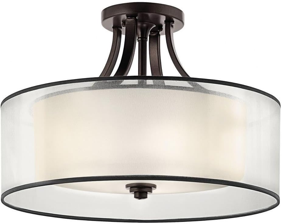 Product Description The Lacey 15" 3 light semi flush features a classic look with its Venetian detail of curves in Mission Bronze finish and satin etched cased opal inner diffusers and light umber translucent organza outer shade. The Lacey semi flush is perfect in several aesthetic environments, including transitional and traditional. From the Manufacturer The Kichler Lighting 42386MIZ Lacey 3-Light Semi-Flush Ceiling Light offers a beautiful contrast, melding the charm of olde world style with clean modern-day materials. The fixture features a mission bronze finish and bold, unadorned rounded-arm styling. Whether you are looking for that perfect ceiling light for your bedroom, hallway, or utility; this fixture features an avant-garde double shade made of a decorative mesh screen and opal inner glass making it the perfect choice for anyone looking to bring a transitional feel to their home. The 3 light semi-flush ceiling light measures 15-Inch wide and 11-Inch high. The 42386 uses three medium base A19, 75W (maximum) bulbs. This product is best suited for use with self-ballasted, compact fluorescent lamps, 18-25W (maximum). Pairing with any of the Lacey family (all sold separately) will surely make a stunning statement. This fixture is sold one per package and is certified and listed to UL/CSA/ETL standards for dry location use in the USA and Canada. Since 1938, Kichler Lighting has offered a distinctive array of lighting solutions that reflect your individual personality, tastes and plans. Kichler brings you an unparalleled variety of exciting style families, unique finishes, fresh colors and unequaled quality. Whether it's casual, contemporary, transitional or traditional, you'll find it with Kichler, lighting that defines your style.