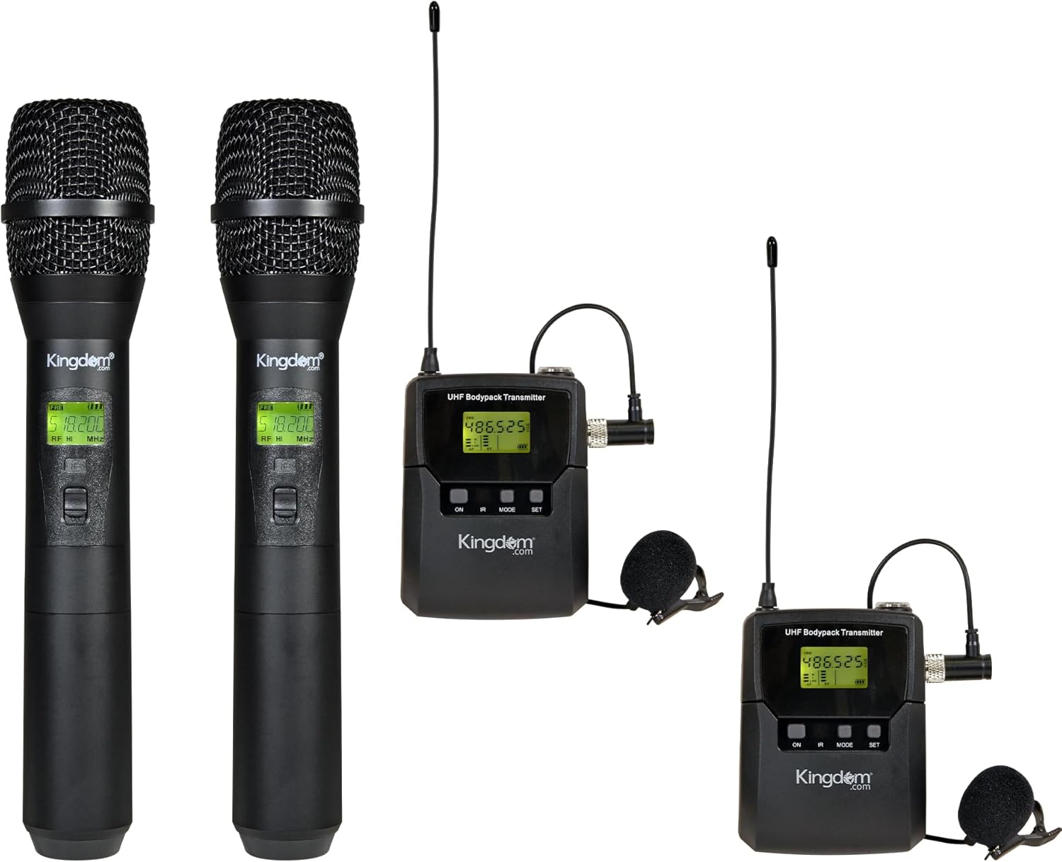 Kingdom Professional Wireless Mic System – 1000 Channel UHF Microphone System Speech with 2 Handheld, 2 Bodypack & Lapels for Speech, Singing, Church, Presentations, Karaoke, DJ, Party, and Classrooms.Kingdom Wireless Microphone System is specially designed to for true sound for vocals and singing, providing a clear listening experience for occasions such as church services, events, interviews, parties, podcasts, singing, presentations, performances, karaoke, announcements, and classrooms.Wireless mic system that is built to last, sounds great and gives you the freedom to roam. No more interference. No more poor sound quality. Experience crystal clear communication.Features:● 2 Hand Held Mics. Individual mute options● 2 Bodypack & Lapels● Extraordinary true sound with low distortion● Display: LCD IR sync capable● 1000 Channels● Individual Volume Controls● Light and Smart● Frequency Response Handheld: 50 Hz~18 KHz● Wide range. Working Distance: ~200 feet● Transmitter Power: up to ~50mW● Carrier Wave Frequency Range: UHF 516.0 - 541.0 MHz● Auto Scan● External Wall Wart Power Supply● Requires AA batteries (not included)Net Weight: 16 poundsPackage Includes1 × 1000-channel UHF metal receiver2 × Handheld mics2 × Bodypack2 × Lavalier/lapel microphone2 × Antennas 1 × User manual 1 × Audio cableWarranty: 30-day returns and warranted to be free of manufacturing defects for 1 yearCustomer Support: We create and design our products for your comfort, ease, and satisfaction. If you have any questions, feel free to ask. We are always available to help.