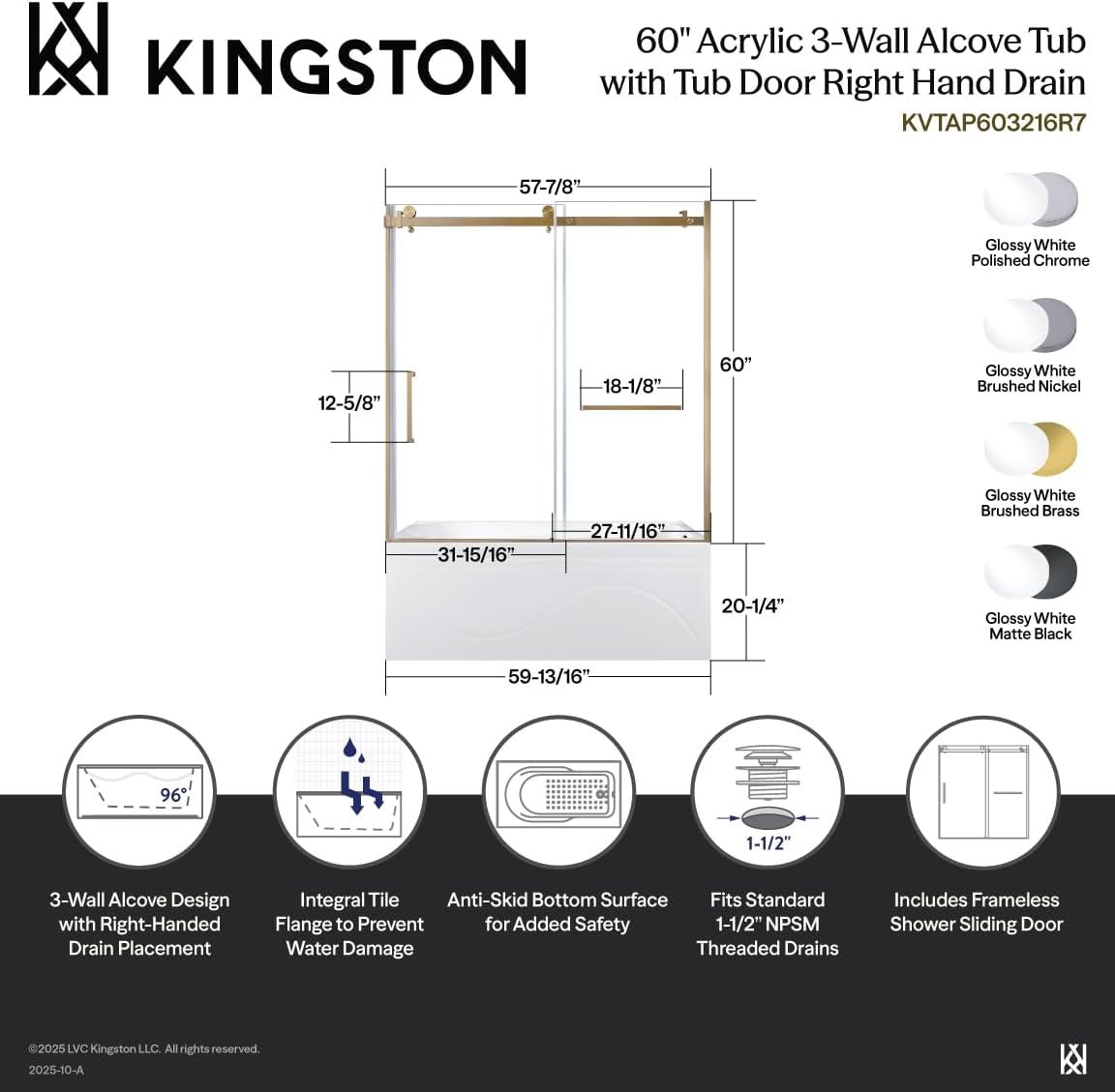 Upgrade your bathroom with the Kingston Brass 60" Acrylic Rectangular 3-Wall Anti-Skid Alcove Tub. Featuring a secure anti-skid surface and a sleek frameless sliding door, this tub offers both safety and style. Crafted from durable acrylic for lasting performance, its 3-wall alcove design maximizes space efficiency. Experience the perfect blend of modern aesthetics and practical functionality—this tub is your ideal choice for a chic and practical bathroom remodel!