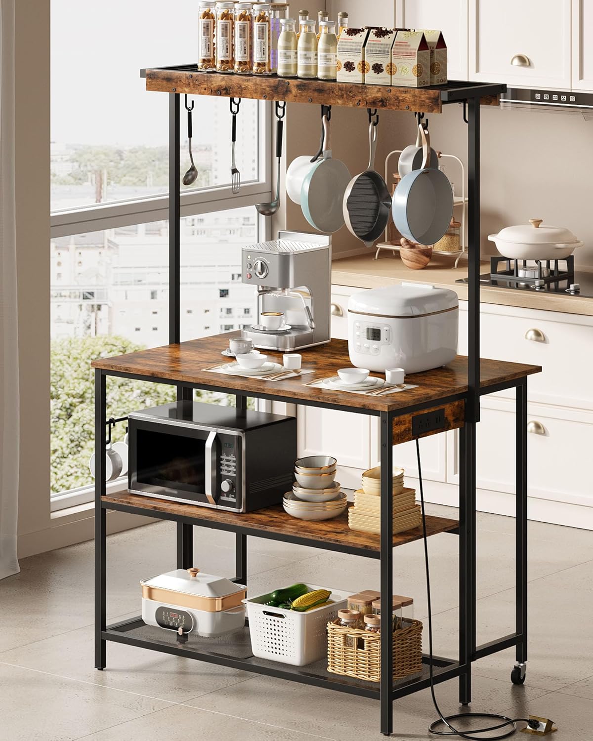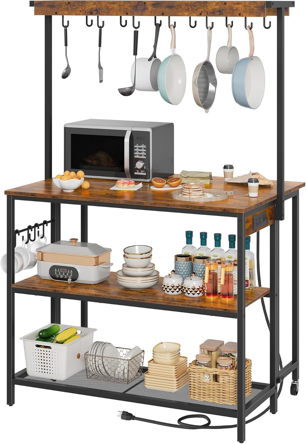 CHOEZON Round Bar Table - Creating a Cozy and Stylish Space - The fusion of vintage wood grain with black metal showcases a sleek industrial aesthetic, suitable for living rooms, kitchens, balconies, and bars. - Equipped with double-layer panels and a robust metal frame, it ensures stability and load-bearing capacity, complemented by ample storage. - The simple lines outline a beautiful and chic shape, while the delicate color adds personality and taste to your living room. -This multifunctional kitchen island with a power outlet is perfect for your living room, dining area, or kitchen. It's ideal for baking, enjoying tea, working, and hosting family gatherings. It also offers ample storage with three lower shelves and upper hook storage, making your life more convenient. - Made with a high-quality wooden tabletop and a sturdy metal frame, it is very stable. The natural wood grain finish seamlessly blends with the black metal frame, matching any home style.
