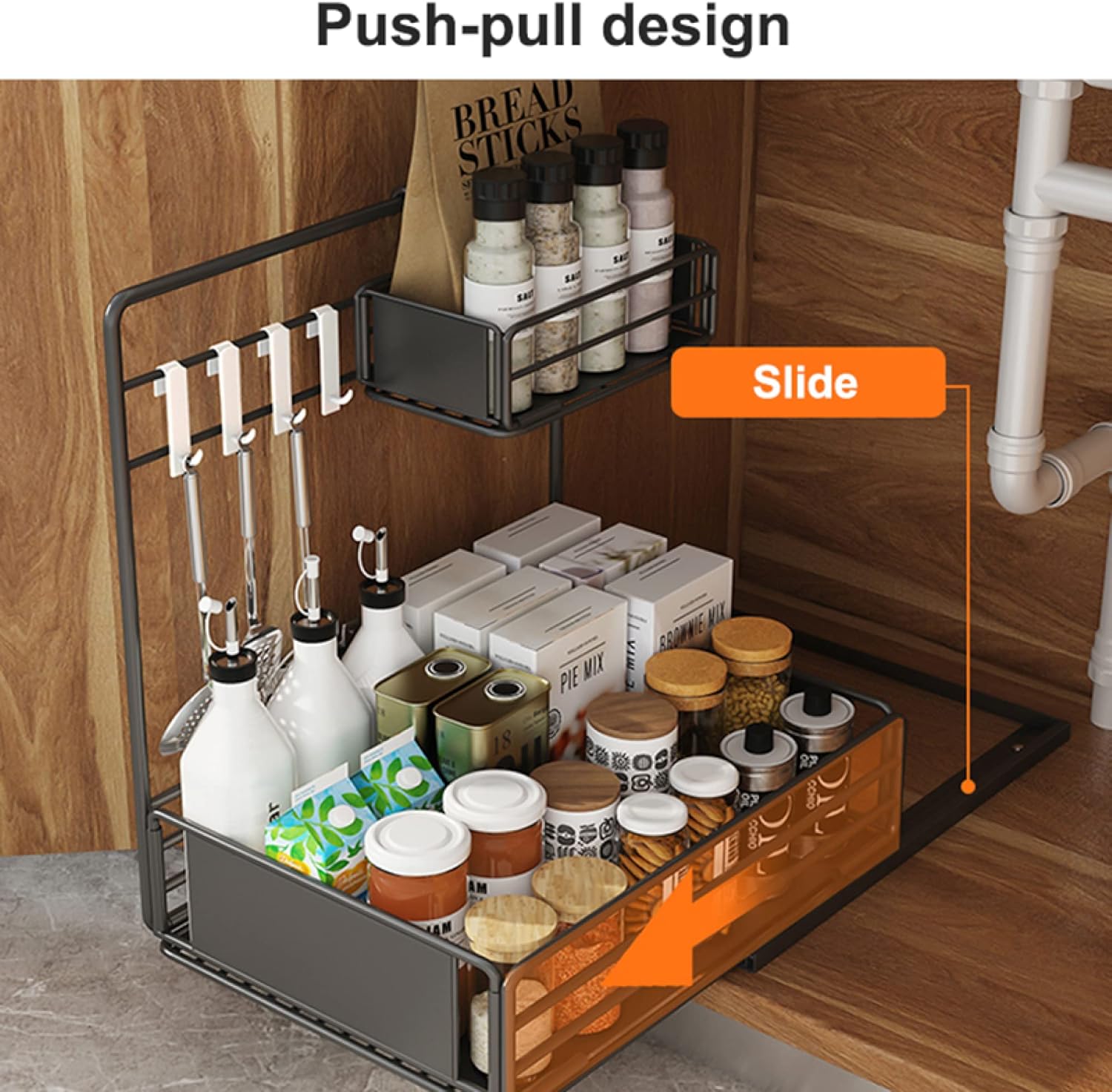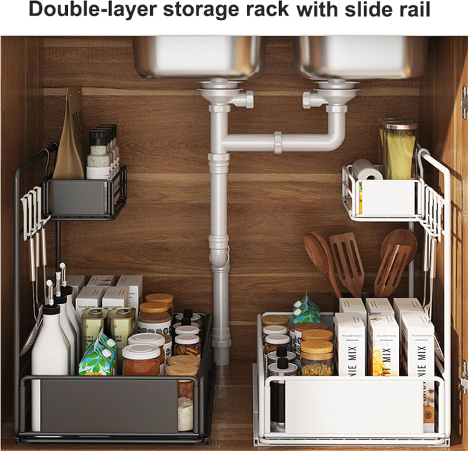 Are your cabinets full of pots, pans and other bulky kitchen accessories If it is, our products can help you maximize the space and improve efficiency of cabinets, which means you can keep your home neat and tidy. 2 Tier under sink pull out cabinet organizer works in either the right or left side of base cabinets to fit in those tight spaces around your plumbing.Product name: under sink organizerMaterial: metal ironColour: black/whiteSurface Finishing: Baking paint+/powderSize: 41x32.5x43cm/16.1x12.8x16.9inchPacking: 45x43x6cm/17.7x16.9x2.4inchWeight: 4.3kg