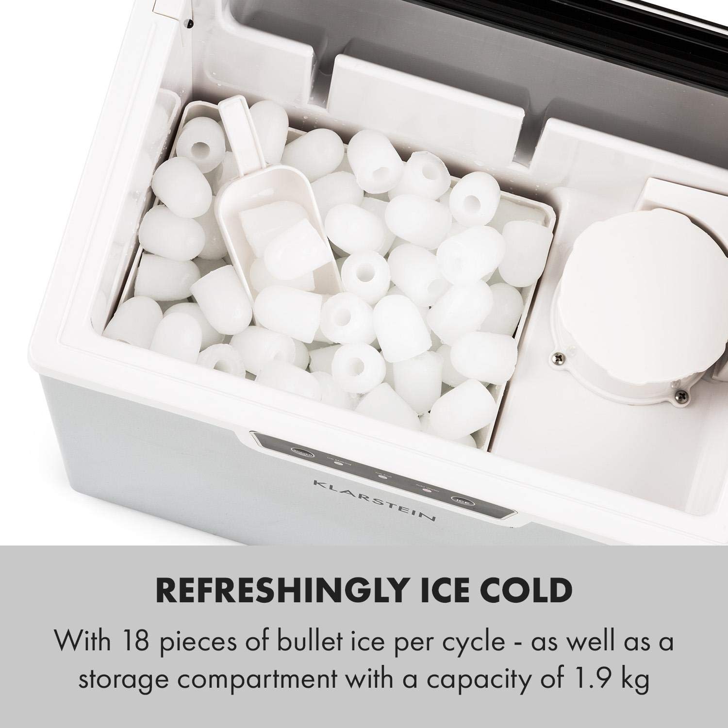 Klarstein Ice Festival ice maker for home and kitchen, 3L capacity, fast operation, crushed ice machine or ball ice machine. The Klarstein Ice Maker is an essential kitchen accessory that makes it easy to add medium-sized ice cubes to any beverage, including cocktails, water and soft drinks. Breaking the Ice The handling and operation of this ice maker is simple and straightforward. Just add water, click on the LCD touch screen and the ice maker does the rest. It can make up to 20 ice cubes per 12-minute cycle and produce up to 20kg of clean ice in a single day. The coolest features For long-lasting fun and ice at will, this ice maker is equipped with an innovative self-cleaning function. The ice maker also includes a reminder alarm that lets you know when it's time to refill the machine or if you've added too much water. An alarm also lets you know when the ice tray is full of fresh ice Product Features Creates ice cubes in the shape of small or large balls for drinks Makes up to 12 ice cubes per cycle An alarm tells you when it's time to refill the device. BPA-free ice maker with removable drip tray Self-cleaning function Box contents: 1 x ice machine. 1 x ice tray. User guide in several languages Dimensions: Dimensions: 31.3 x 40 x 42.5 cm (L x H x D) Weight: 14 kg Water inlet/outlet size: 8mm / 10mm