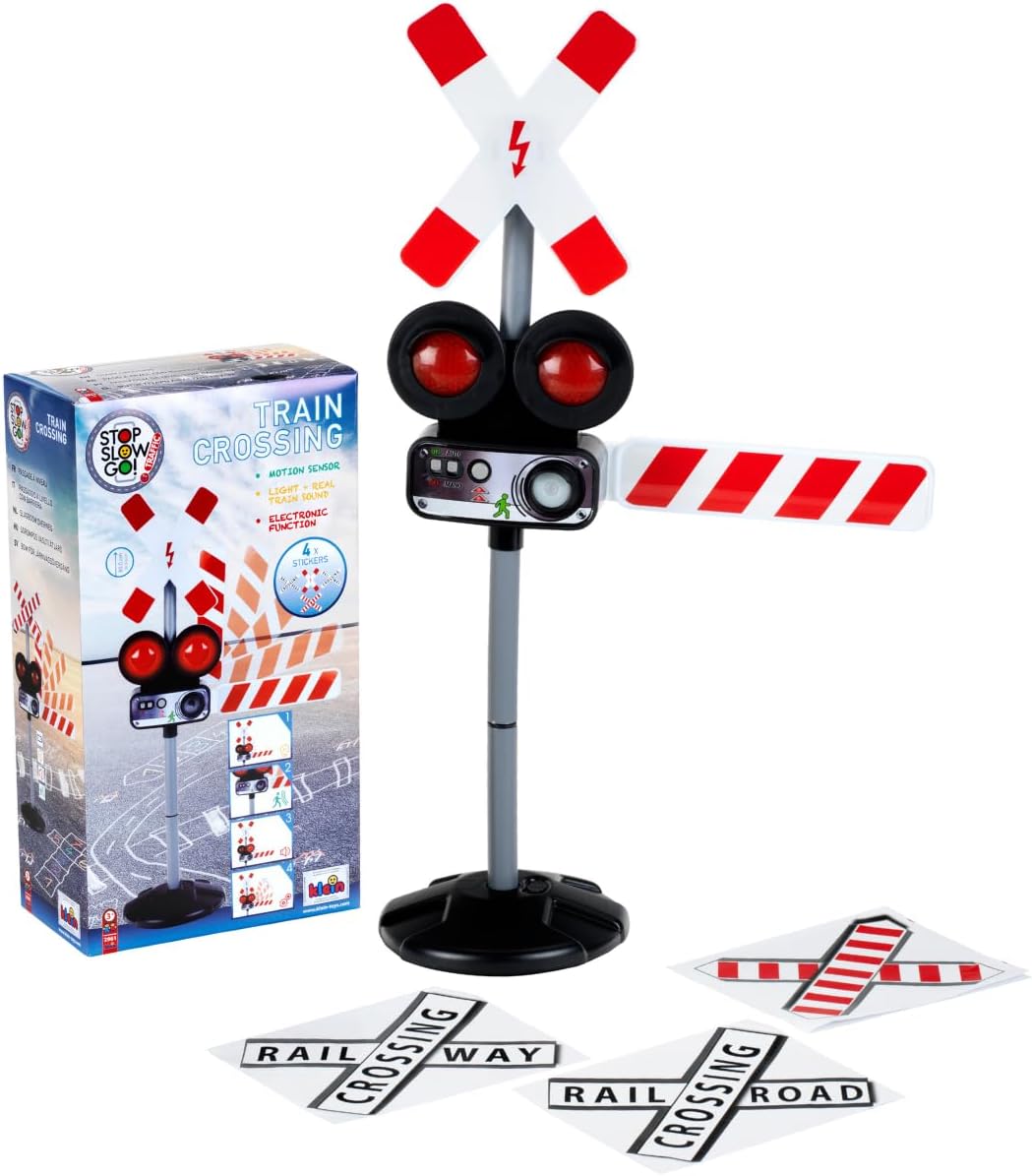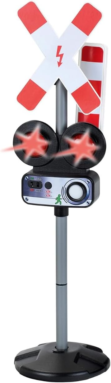 THEO KLEIN: LIGHT & SOUND TRAIN CROSSING - This small level crossing can do everything a big one can: It automatically switches to red, raises the movable barrier or closes it with the appropriate light and sound effects and thus teaches even the youngest children to obey rules. Good to know for educators and parents: The level crossing can also be operated manually if the little ones are to learn to wait dutifully for the level crossing to be clear again. At the same time, the children traffic education sign is inherently stable: The base, reminiscent of real mobile road signs, can even be weighted and made even more stable: Just fill it with water and the traffic light will withstand small bicycle, scooter and tricycle rides. Product Dimensions: 18.11" x 7.09" x 31.50".