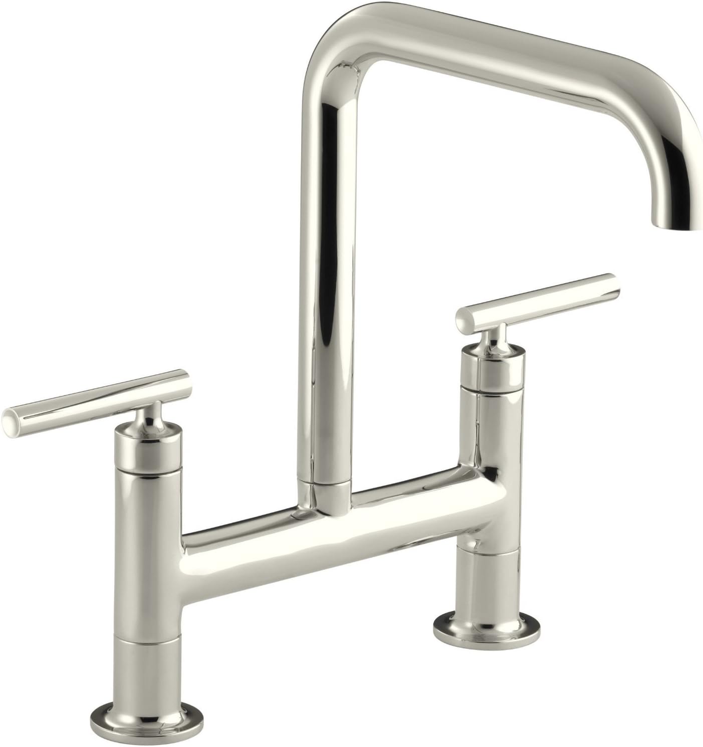 Product Description PURIST® DECK-MOUNT BRIDGE FAUCET Amazon.com Kohler's Purist deck-mount bridge faucet brings the simple, architectural form of the Purist line into the kitchen. This faucet is easy-to-use and has a modern visual appeal while still being feature-rich and simple to clean. It is available in four colors: matte black, polished chrome, polished nickel, and stainless. The Purist faucet is also available in a version that comes with a coordinated sidespray. High Spout DesignKohler's Purist deck-mount bridge faucet has a high-arcing curved spout for increased clearance and reach, a classic faucet design that not only creates a distinctive styling all of its own but also delivers great functionality. The spout has a 360-degree swivel, which is especially practical for island installations. A Host of Helpful FeaturesKohler's Purist deck-mount bridge faucet has many features that will help you in the kitchen, including unique lever handles that are easy to operate and complement the design aesthetic while offering improved ergonomics, durable all-metal construction, two quarter-turn washer-less ceramic disc valves, and flexible connections for easy installation Wall Mount OptionThe Purist faucet also has a wall-mount option. This option provides a unique installation design created especially to minimize installation errors and to overcome "roughing in" installation issues and to ensure consistent wall-to-outlet dimensions. Warranty, Dimensions, and SpecificationsThis Purist faucet has a limited lifetime warranty. It measures 8-3/8 inches by 8 inches by 12-1/2 inches, is designed for 8-inch centers, has an 8-3/8-inch spout reach, has a 1.8-gallon-per-minute maximum flow rate, and meets CALGreen requirements for kitchen faucets. About KohlerGracious living is marked by qualities of charm, good taste, and generosity of spirit. It is further characterized by self-fulfillment and the enhancement of nature. The Kohler mission is to improve your sense of gracious living in every experience you have with a Kohler product or service. To make this happen, Kohler tries to operate on the leading edge in the design and technology of product and process, maintaining a single level of quality regardless of price point across many product and service categories. What's in the BoxOne Kohler Purist deck-mount bridge faucet. P.when('A').execute(function(A) { A.on('a:expander:toggle_description:toggle:collapse', function(data) { window.scroll(0, data.expander.$expander[0].offsetTop-100); }); }); From the Manufacturer The simple, architectural form of the Purist faucet line has been extended into the kitchen. Purist remains intuitive to use and minimal in form, creating visual appeal and an honest interpretation of classic modernity. The deck-mount bridge faucet, featuring a high curved spout for increased clearance and reach, reintroduces a classic faucet design that not only creates a distinctive styling all of its own but also delivers great functionality with ease of maintenance and cleanup. See more