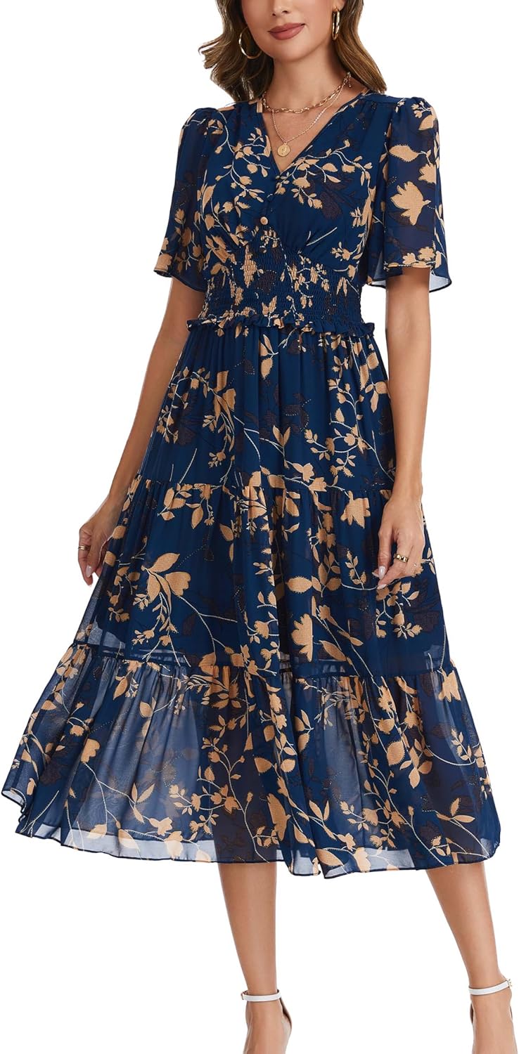 Kormei Women's V Neck Short Sleeve Boho Smocked Long Flowy Summer Dress Wedding Guest Engagement Dresses