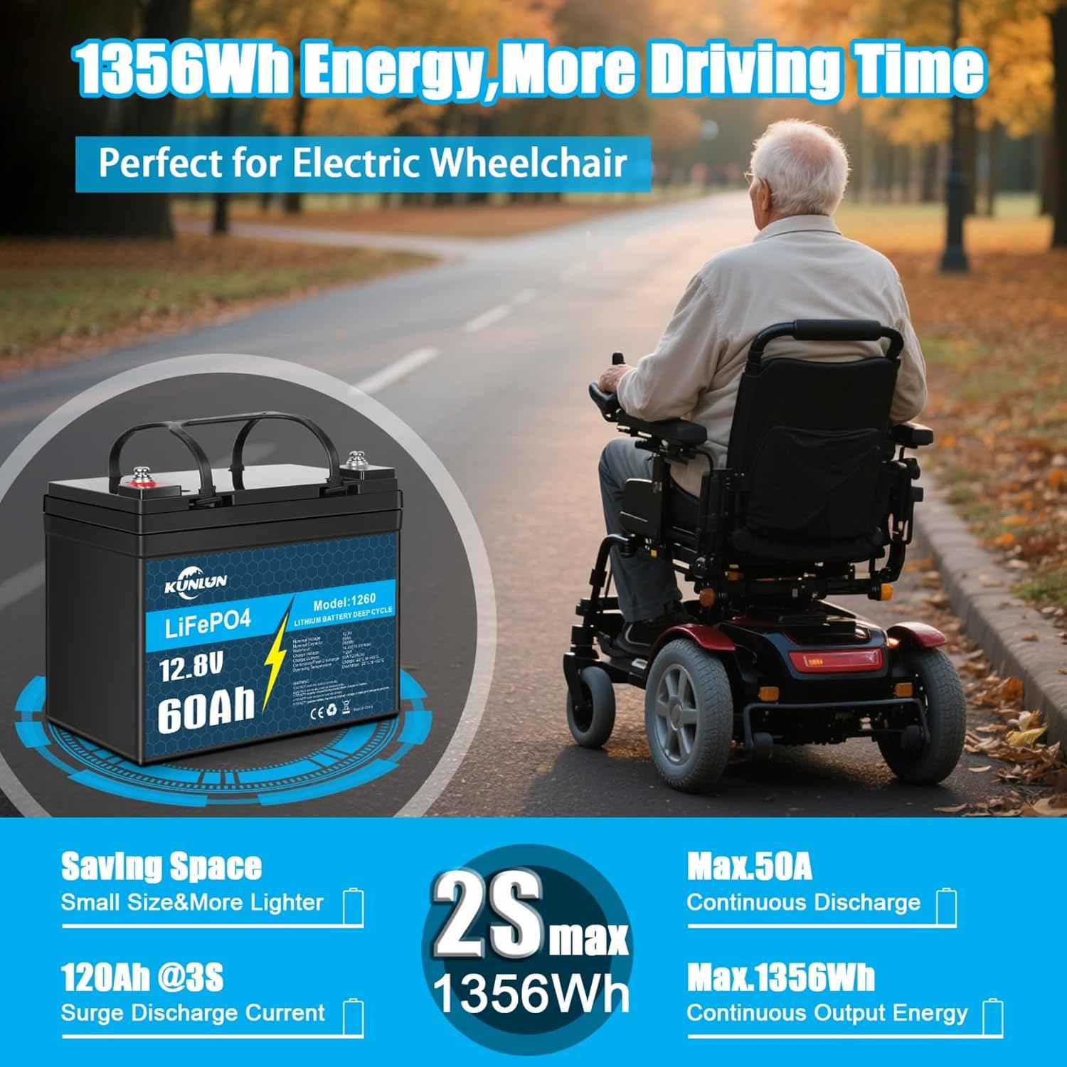 KUNLUN 12V 60Ah LiFePO4 Battery Mini Perfect for Trolling Motors, Marine, Boat, Yacht, RV, Solar Off-Grid, Built-in 50A BMS with Low-Temp Protection 12 Volt Deep Cycle Lithium Iron Battery