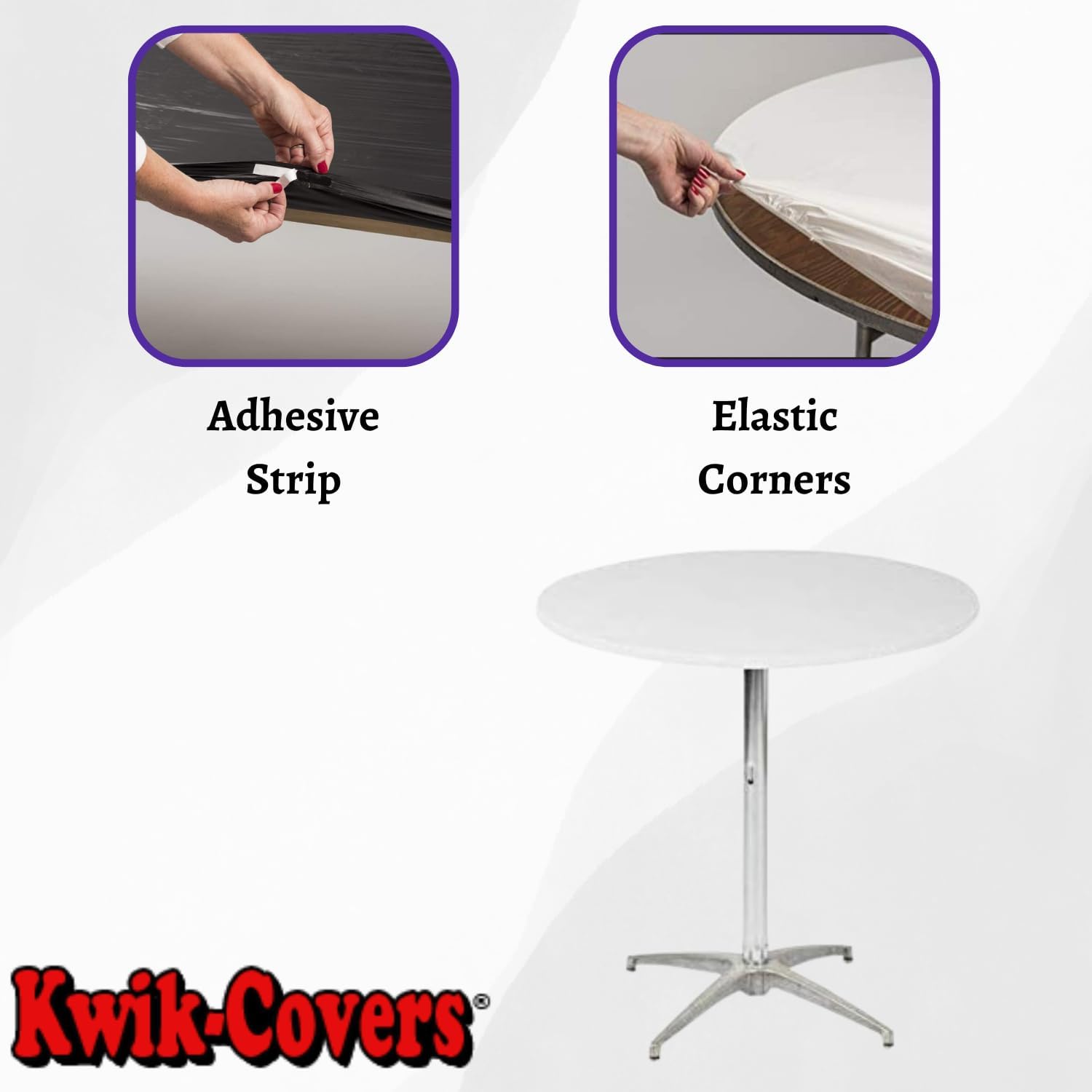 30" (2.5') Round Kwik-Covers are a lightweight, elastic fitted vinyl table cover with specially-designed elastic edging that holds the cover in place, even in the wind. Kwik-Covers are made with the environment in mind. Because Kwik-Covers are made with elasticized edges and are easy to clean, you have the option to use them over and over again. Kwik-Covers are so easy to put on and take off, all you need to do is wipe them off and fold them for the next use. Kwik-Covers are durable enough to be re-used, yet affordable enough to be disposed of after a single use making clean-up “a snap!”