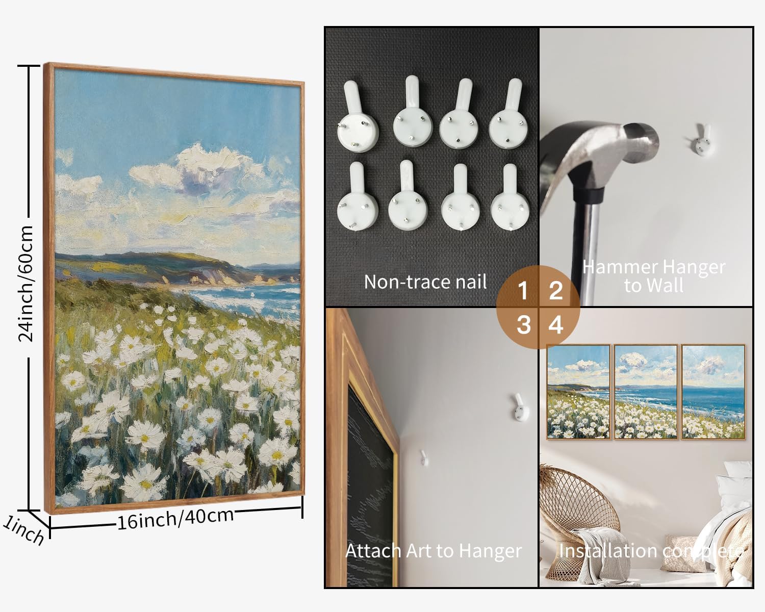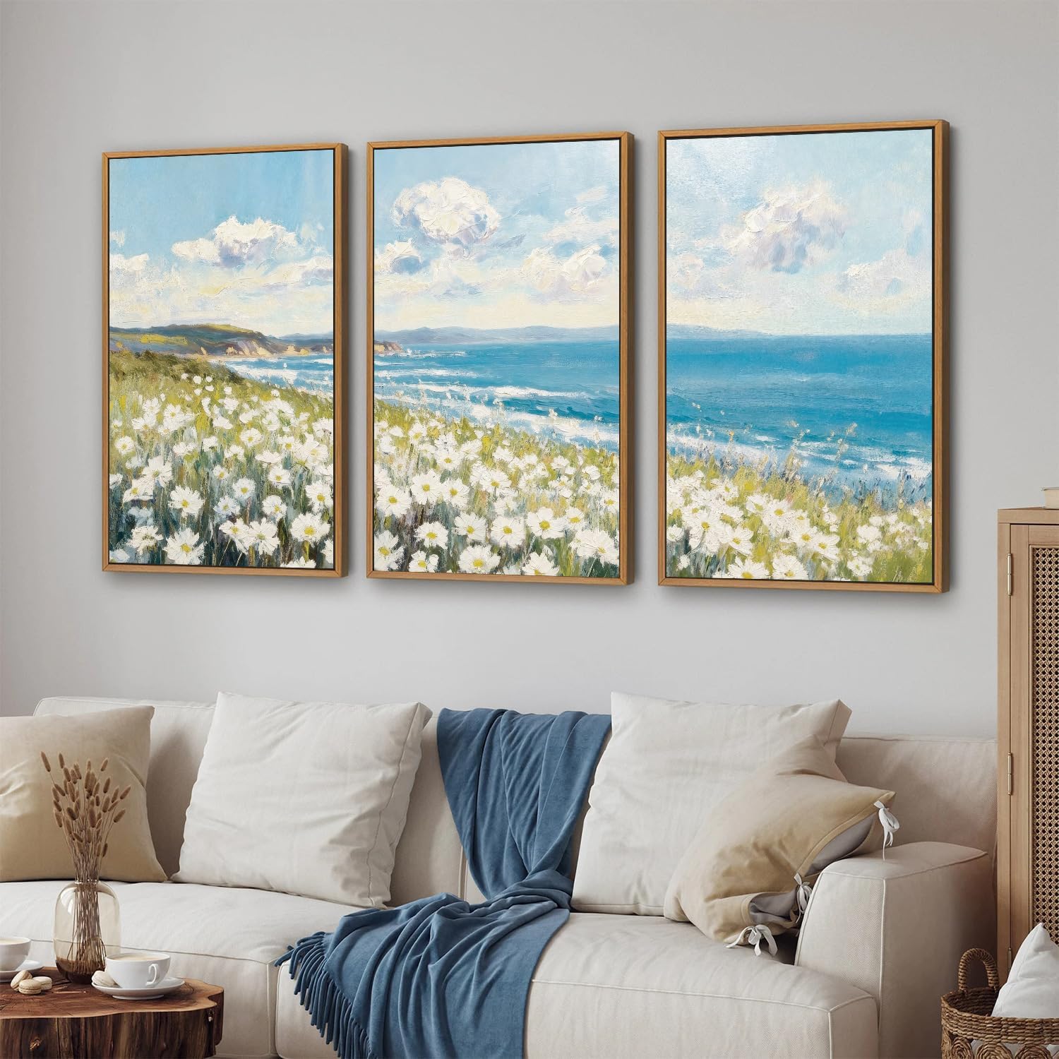 KYLESONLIE Large Summer Wildflower Framed Canvas Wall Art, Cozy White Daisy Wall Decor, Impressionist Coastal Art Paintings, Pastel Seaside Landscape Artwork for Living Room Bedroom Office 16"x24"x3