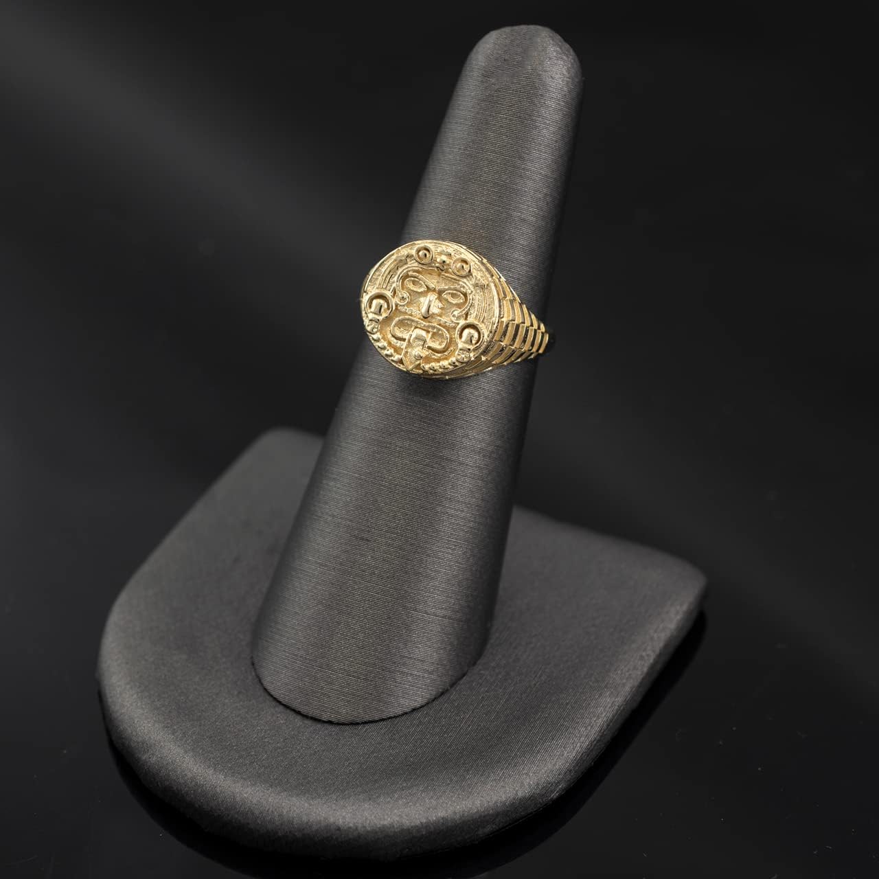 Embrace the Bold History of Aztec and Mayan Cultures. The Rugged Aztec Mayan Sun Ring in Yellow Gold is a tribute to the bold and captivating history of Aztec and Mayan civilizations. The Aztecs and Mayans were known for their impressive artistic abilities and intricate jewelry designs that often included symbols and patterns inspired by nature. The Rugged Aztec Mayan Sun Ring is no exception, featuring a unique sun design that symbolizes power, leadership, and strength.Experience the Beauty of Yellow Gold Jewelry. This Aztec Mayan Sun Ring in Yellow Gold is a true work of art that exudes luxury and elegance. Crafted from high-quality yellow gold, the Rugged Aztec Mayan Sun Ring is a statement piece that adds sophistication and style to any outfit. The sun design on the ring adds a touch of warmth and radiance to the piece, making it perfect for any occasion.Make a Statement with the Rugged Aztec Mayan Sun Ring. The Rugged Aztec Mayan Sun Ring in Yellow Gold is a bold and captivating piece that is sure to turn heads. The ring's rugged design and unique sun emblem make it a statement piece that will make you stand out from the crowd. Whether you're dressing up for a formal event or looking to add some flair to your everyday wardrobe, the Rugged Aztec Mayan Sun Ring is the perfect choice.Gold Purity: 10K goldMetal : Yellow Gold.Ring width (diameter): 0.5" (12.5 mm).Ring Height: 0.83".Weight : 4 g. (10k)Finish: rugged.Back: hollow.Gender: unisex.Made in the USA.