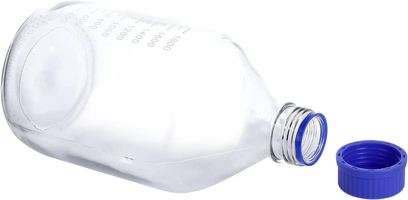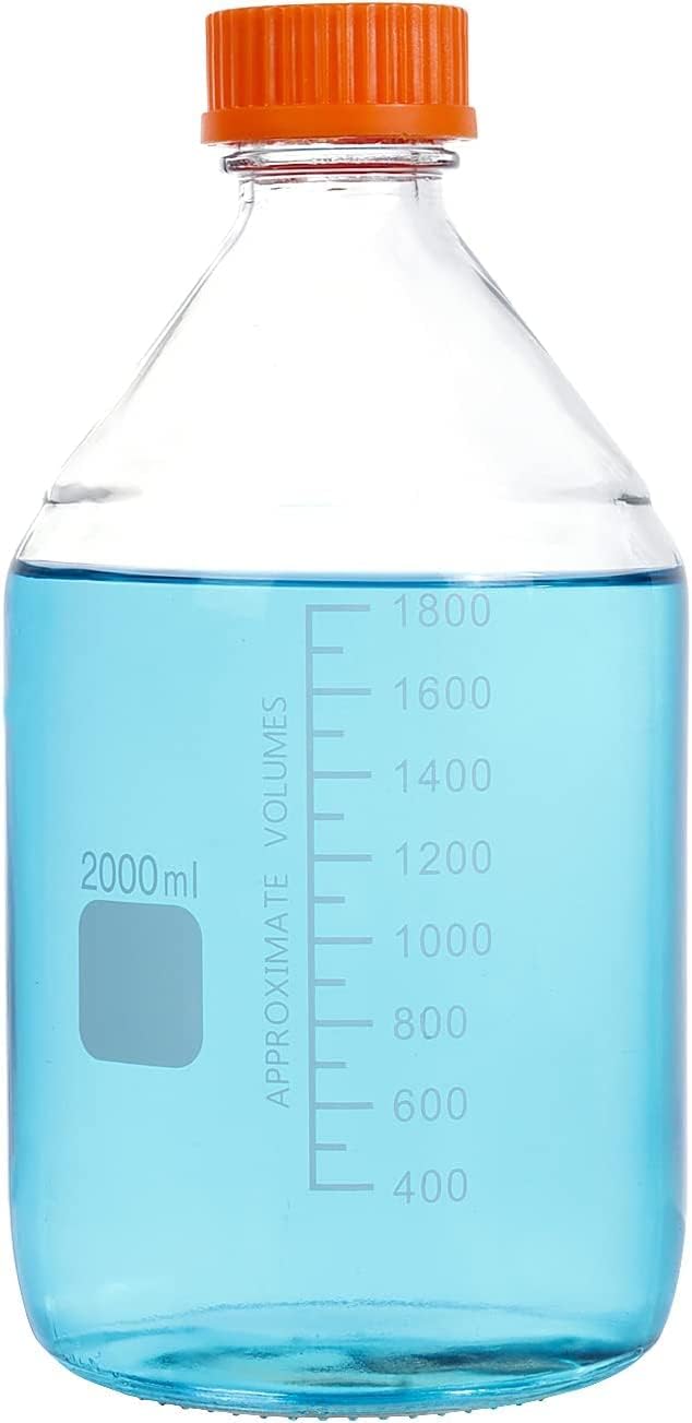 Capacity: 2000 mL (2 liter) pack of 1 bottle, accurate permanent white enamel graduation lines, precise scales for measurement, easy labeling for markings and identify Safe Glass: thick, tough, sturdy, transparent, high quality, low coefficients of thermal expansion, resistant to thermal shock, high chemical resistance in corrosive environments, autoclavable bottle GL45 Screw Cap & Leakproof Design: tight seal, drip-free pouring ring, Leakproof reduces the risk of liquid evaporation and exposure, polypropylene material (PP) cap up to 140℃, reusable, environment friendly Durable and Easy to Clean: autoclavable and sterilize by high-pressure steam up to 120 ℃ degrees C. Note, do not tighten the cap immediately after autoclaving - the resulting cooling vacuum could break the glass Optimal Solutions: Reagent glass bottles fit for mixing sampling and storage of media, biologicals and other liquid solutions for lab, experiment, chemistry, industrial, scientific studies and storage at kitchen and home uses We provide trustable service for our customer partners, GURANTEE with Replacement or Refund for broken, shattered or imperfections Bottles due to shipment