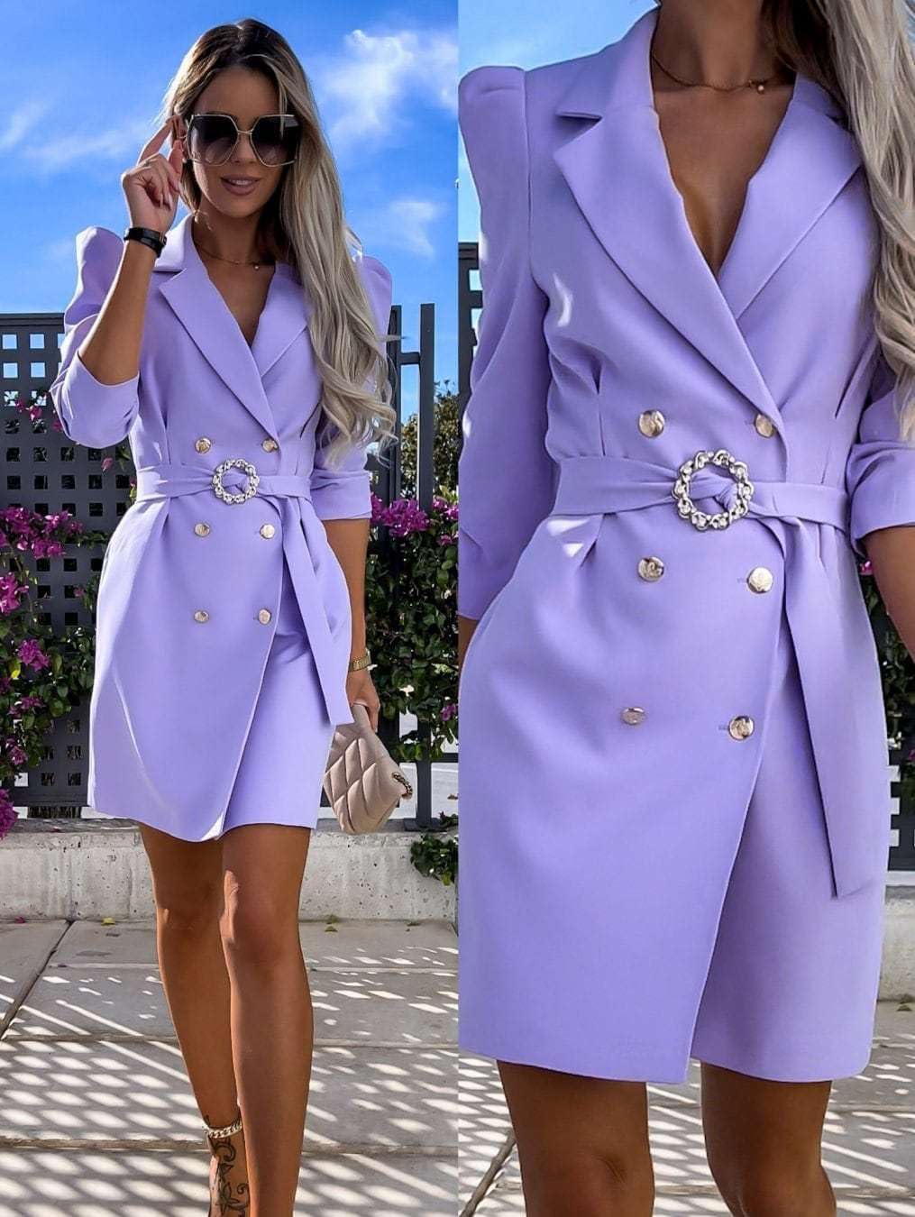 This stunning double-breasted blazer dress combines professional sophistication with contemporary fashion flair. The eye-catching design features dramatic puffed shoulders that create a bold, confident silhouette perfect for making a statement. The tailored V-neckline offers an elegant touch while the double-breasted front with decorative buttons adds classic refinement. What sets this piece apart is the gorgeous pearl-embellished circular belt buckle that cinches at the waist, creating a flattering hourglass shape. The included tie belt allows you to adjust the fit to your preference. With three-quarter length sleeves, this versatile mini dress works beautifully for office settings, cocktail parties, date nights, or special occasions. Available in multiple vibrant colors including purple, hot pink, white, and black, you can choose the shade that best expresses your personal style. This blazer dress effortlessly transitions from day to evening wear—pair it with heels and statement jewelry for a polished look, or dress it down with ankle boots for a more casual vibe. The structured yet comfortable design ensures you'll look put-together while feeling confident all day long.