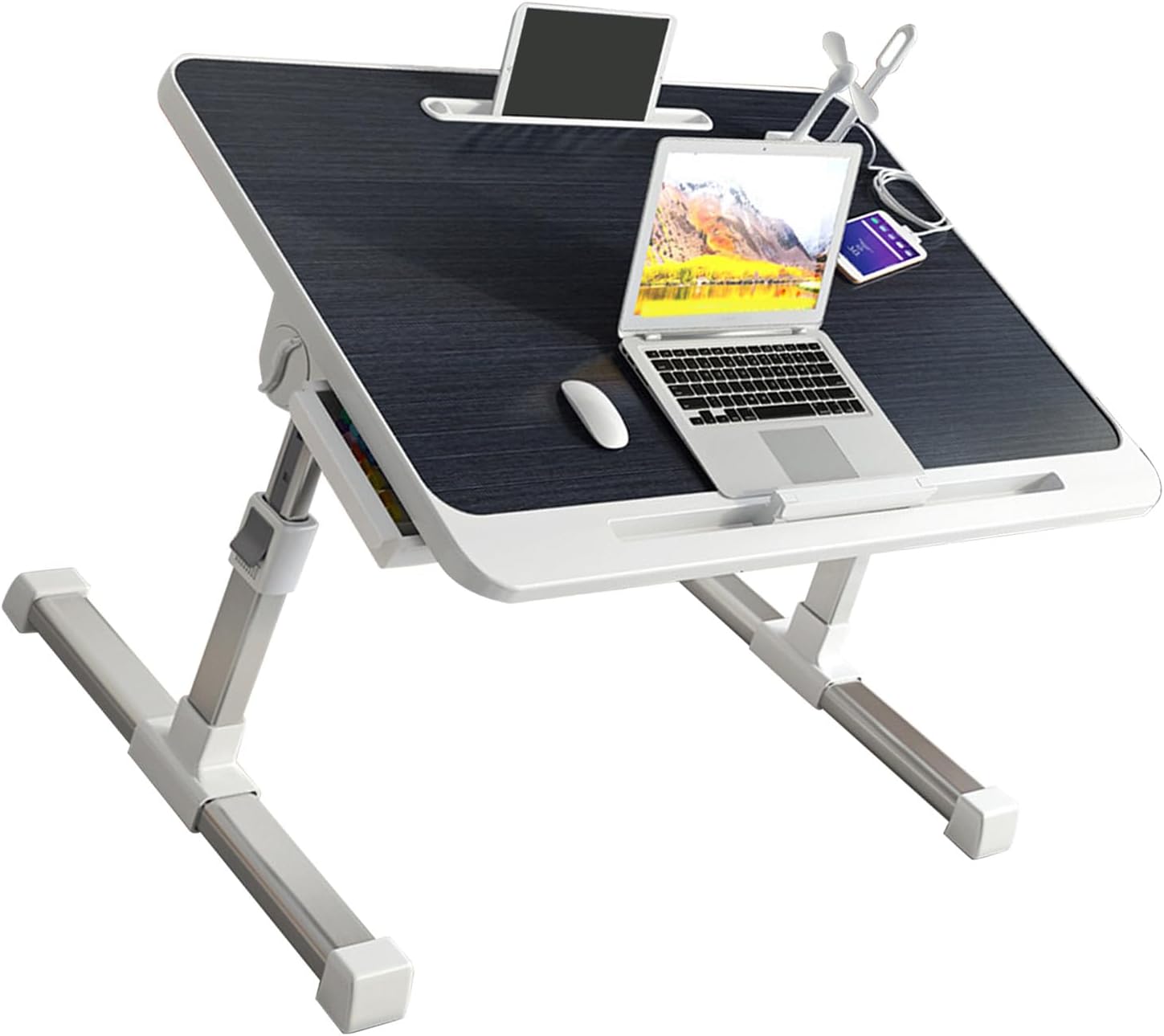 1. Foldable Legs: This laptop bed table features 2 foldable legs, allowing you to customize the height of the table to suit your needs. Whether you're working, studying, or reading, you can easily find the most comfortable position.2. Aluminum Alloy Material: Made of premium aluminum alloy, this laptop bed table is built to last. It is solid and , providing you with a long lasting usage experience.3. Versatile and Spacious: With a large desktop space, this table can accommodate your laptop, books, and other study materials, making it ideal for organizing your work space. It offers convenience and functionality.4. Rotatable Desktop: The desktop of this laptop bed table can be rotated, allowing you to find the perfect angle for your work or leisure activities. Additionally, its foldable design makes storage a breeze, making it suitable for both home and dorm use.5. Minimalist Design: The simple and elegant design of this laptop bed table makes it suitable for various settings such as bedrooms and window sills. It not only adds aesthetics to your space but also serves its purpose effectively.Specification:Item Type: Laptop Bed TableMaterial: Aluminum alloy, plateWeight: Approx. 3200g/112.9ozProduct Size: Approx. 60x40cm/23.6x15.7inHeight: Approx. 27 to 40cm/10.6 to 15.7inPackageList:1 x Laptop Bed Table